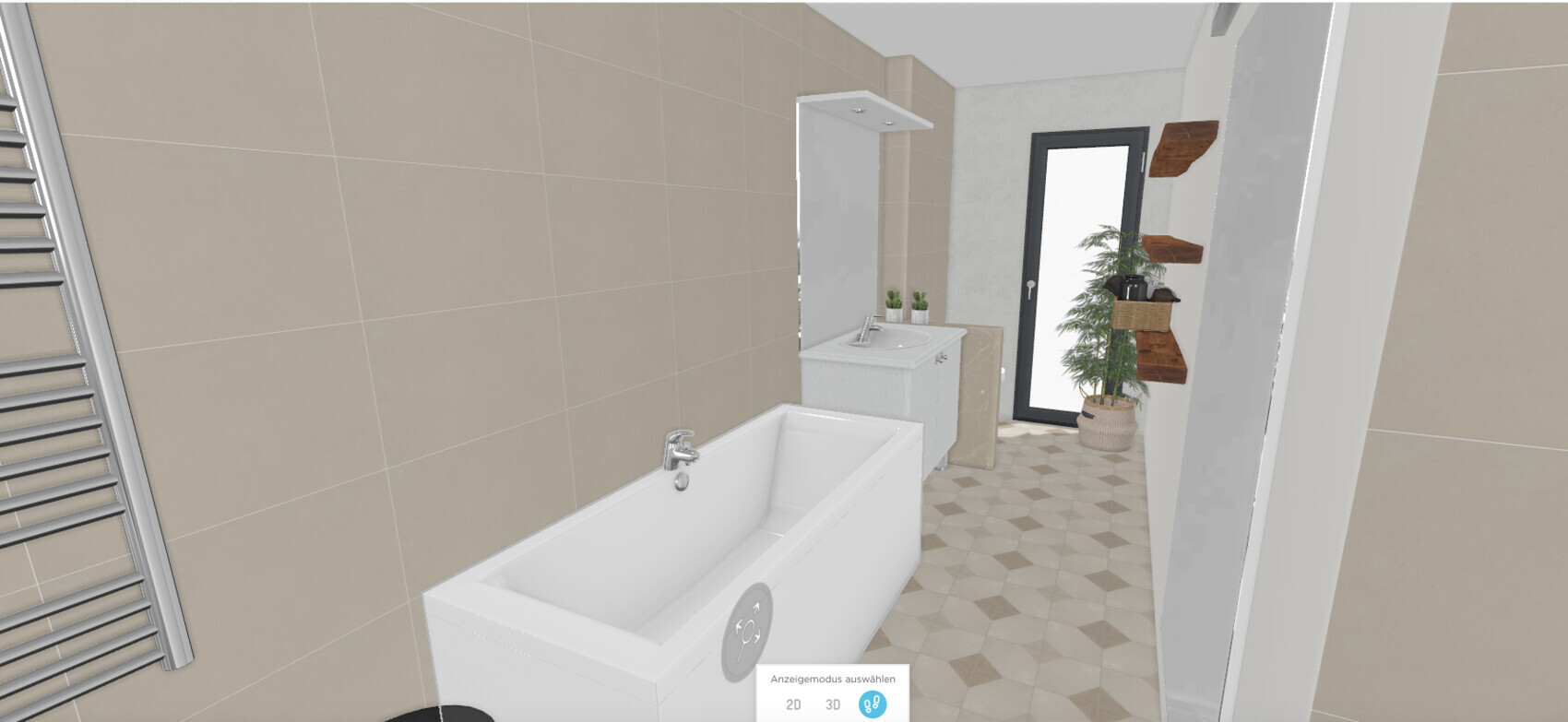 Moderne Badezimmer-3D: Badewanne links, Waschbecken, Tür mit Glasfenster, Pflanze.