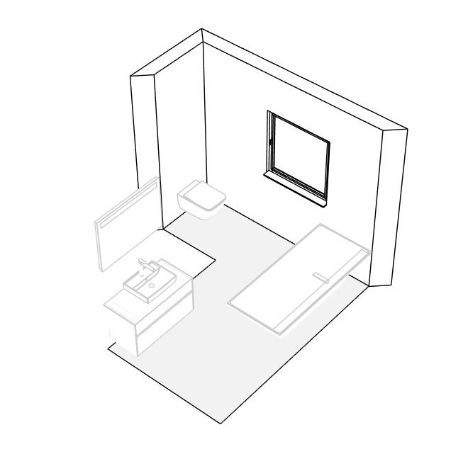 In diesem Fall kann die Badewanne ohne weiteres über das Fenster hinausstehen. Mithilfe der schrägen Form holen wir die maximale Breite heraus und die Wanne steht nicht im Weg. Zusätzliche Ablagefläche planen wir in der Wand.