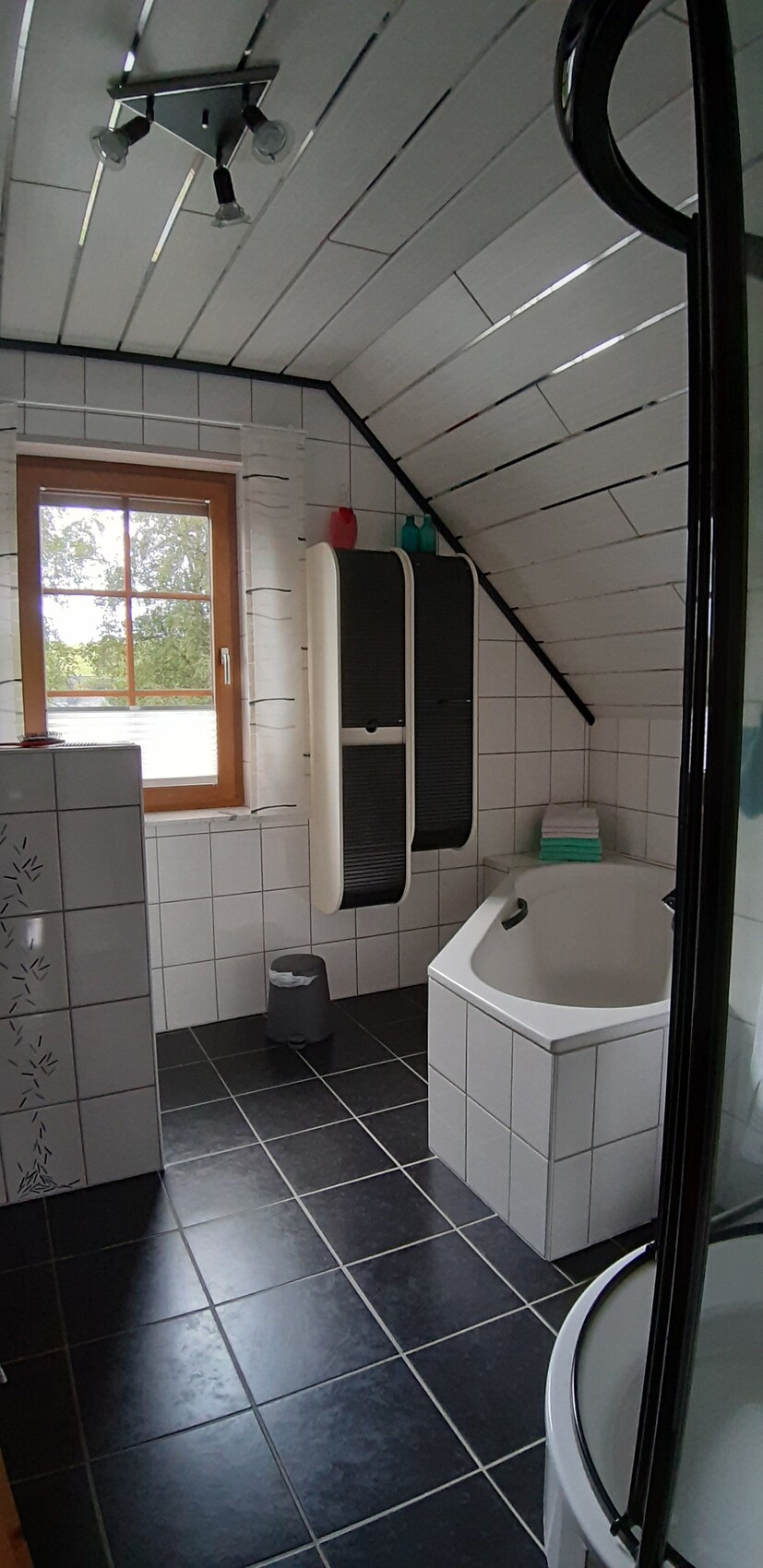 Ich (Papa) gehe davon aus, dass mit 3 Frauen im Haus es irgendwann zu Streitereien kommt wer wann duschen darf. Auch Gästen will man eine Duschmöglichkeit bieten. Aus diesem Grund will ich mir die Option offen halten, dass man im EG auch noch duschen kann. Hier stelle ich mir vor, dass ich eine normale Badewanne wähle und einen KLAPPBAREN Spritzschutz beim Fenstern einbauen lasse.