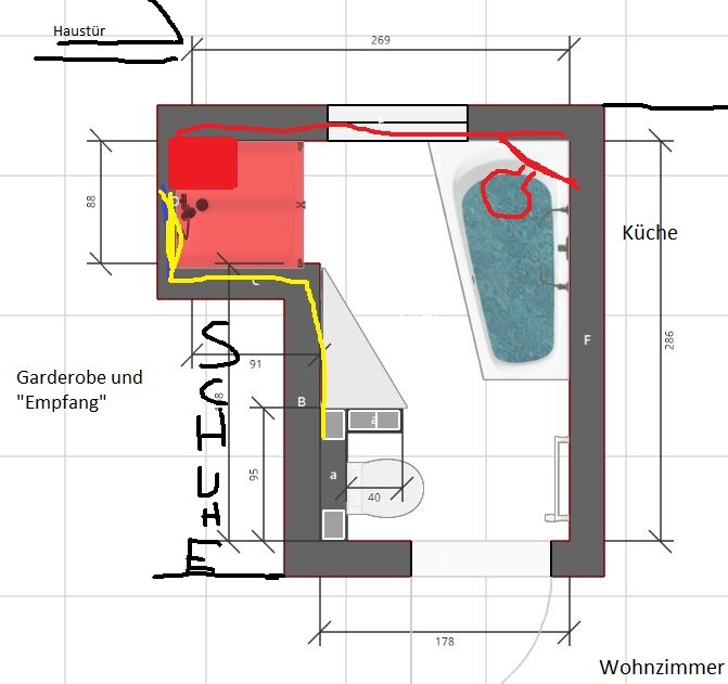 Die aktuell vorhandene Dusche in der Ecke oben links ist bereits ebenerdig. Hoffe das kriegen wir auch in Zukunft so hin. Wenn nicht, müssen wir eine Duschwanne mit einbauen.