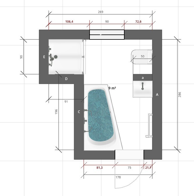 Tür auch noch verschmalert. Der Badplaner hat leider keine richtige Wanne zur Auswahl gehabt.