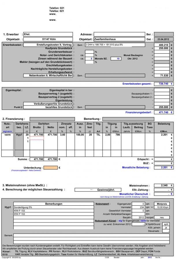 Ich habe Dir einmal eine Berechnung unseres unabhängigen Finanzierungsmaklers - befreit von Kontaktdaten natürlich - angefügt. Dies paßt zwar nicht auf Deine Daten, darin gibt es jedoch eine Position "Nebenkosten lt. Wirtschaftlichkeitsberechnung". Darin sind vorgenannte Positionen erhalten.