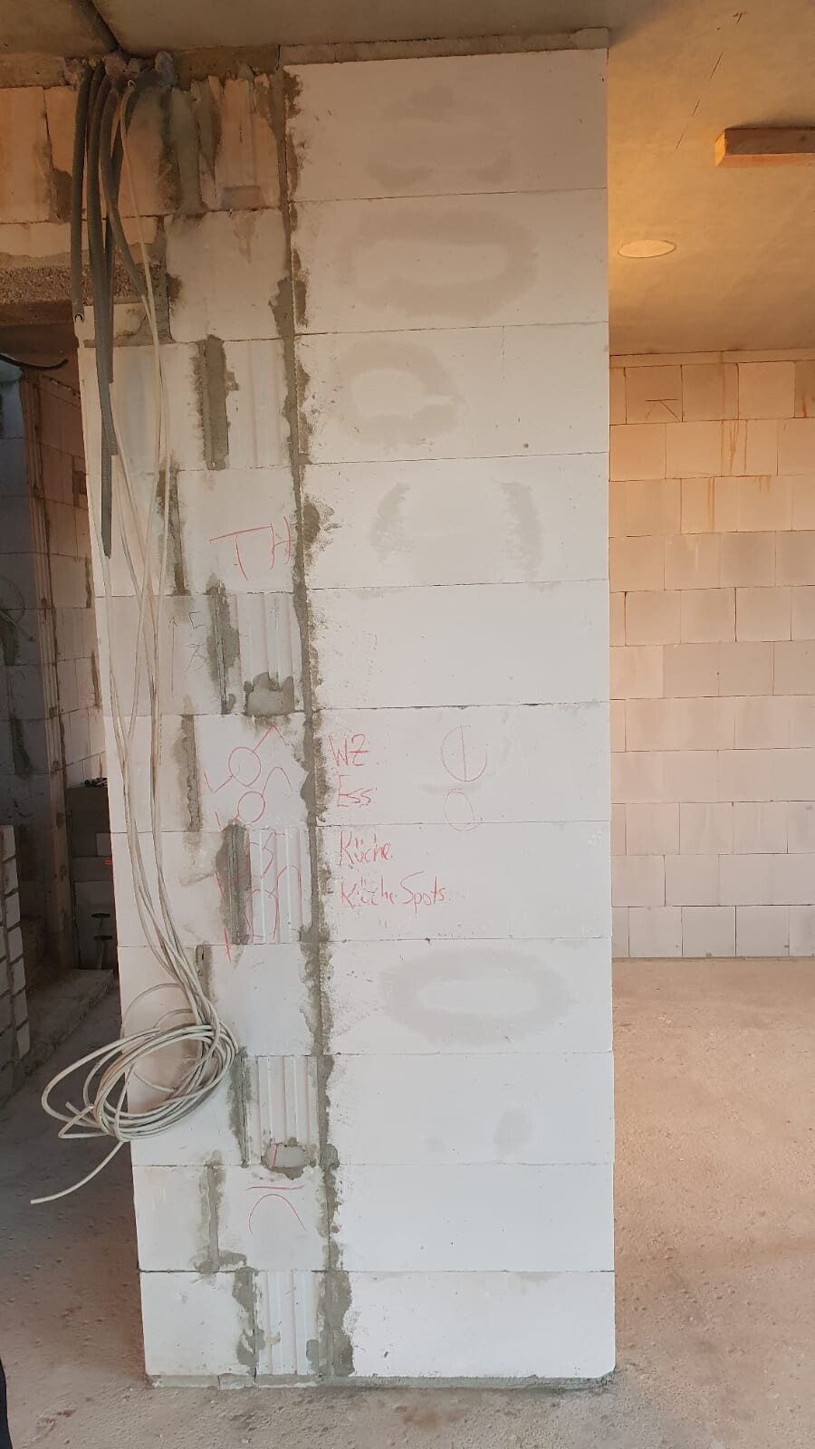 Mir scheint, das ist hier nur bei einem in der Flucht eines Schornsteins angesetzten Mauerstück geschehen (?)Die Wand steht im Raum, es scheint ein Vorsprung zum Abtrennen von Küche zum Wohnraum zu sein.