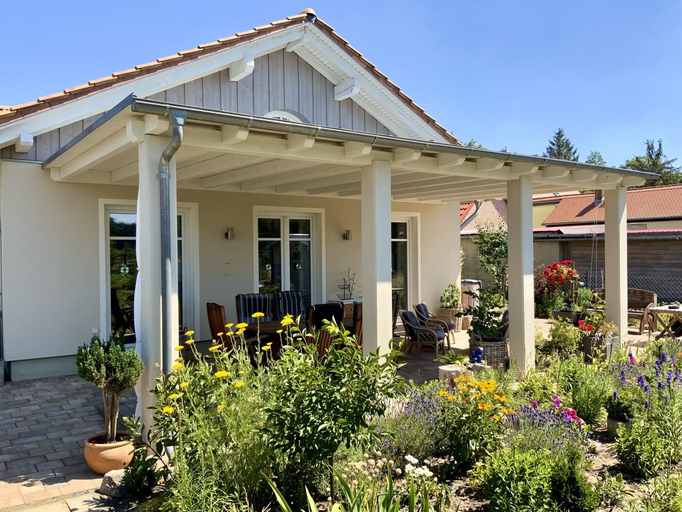 Hallo, ich plädiere für eine feste Überdachung. Für unsere (7x4m) haben wir ca. 8500,- EUR bezahlt. Die vier massiven Säulen hatten wir schon gleich in der Hausbauphase aufstellen lassen. Das Terrassendach (oben Blech, von unten Holz) ließen wir dann etwa 2 Jahre später von unserer Hausbaufirma machen. Wir lieben unsere Terrasse! Sie bringt die angenehme Schattierung im Sommer (wir haben auch Südseite) und Möbel stehen wettergeschützt das ganze Jahr draußen. Wir haben auch nicht das Gefühl, es verdunkelt die Innenräume. Wir haben aber ringsum ausreichend Fenster. Hier Bilder (schon öfter mal gezeigt, aber mit der Zeit rutschen sie ja ins Nirvana.