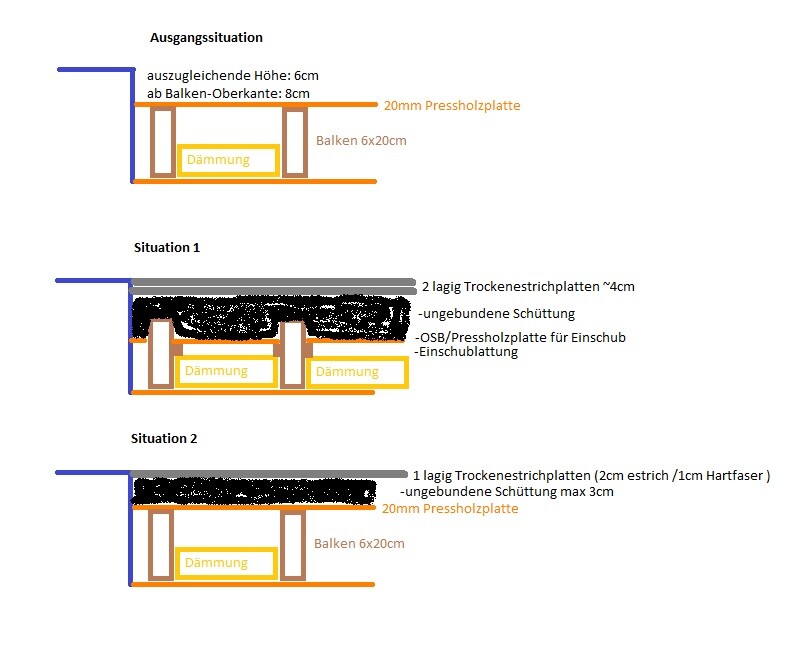 Zur "Situation 2": Natürlich einfacher da die OSB-Platten erst mal so bleiben können, jedoch ist der Bodenaufbau dann auch nicht so hoch. Es kann nur eine Schüttung von ca. 3 cm eingebracht werden und der Rest würde durch Trockenestrichplatten ausgeglichen.
