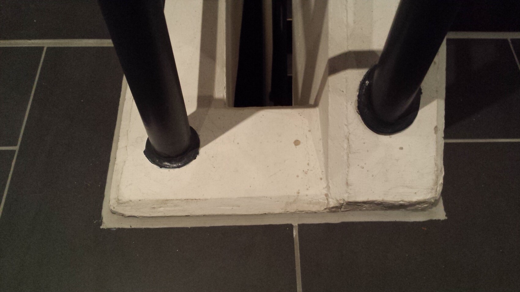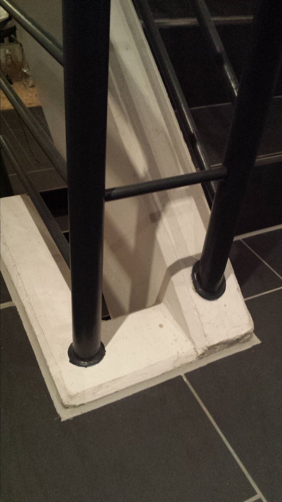 Nahaufnahme von schwarzen Treppengeländerpfosten auf weißer Stufenbasis
