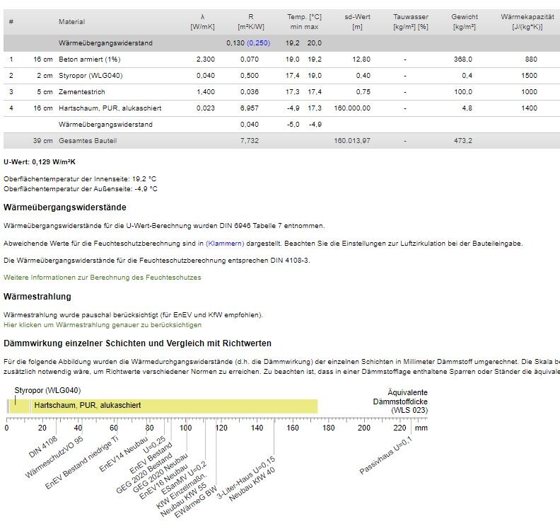 Ich habe mal mit dem neuen gedachten Aufbau mit den 16cm Styroporplatten EPS 035 im U-Wert Rechner gerechnet: