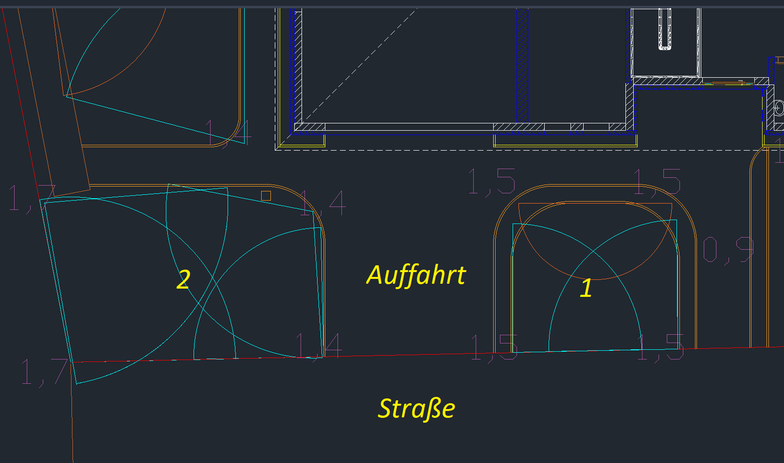 Ich hoffe man kann die Zeichnung soweit erkennen. Also unten die Straße, oben das Haus bzw. Garage. Mittig die Auffahrt, rechts der Weg zur Hauseingangstür. Links führt der Weg zum -noch zu bauenden- Holzunterstand.