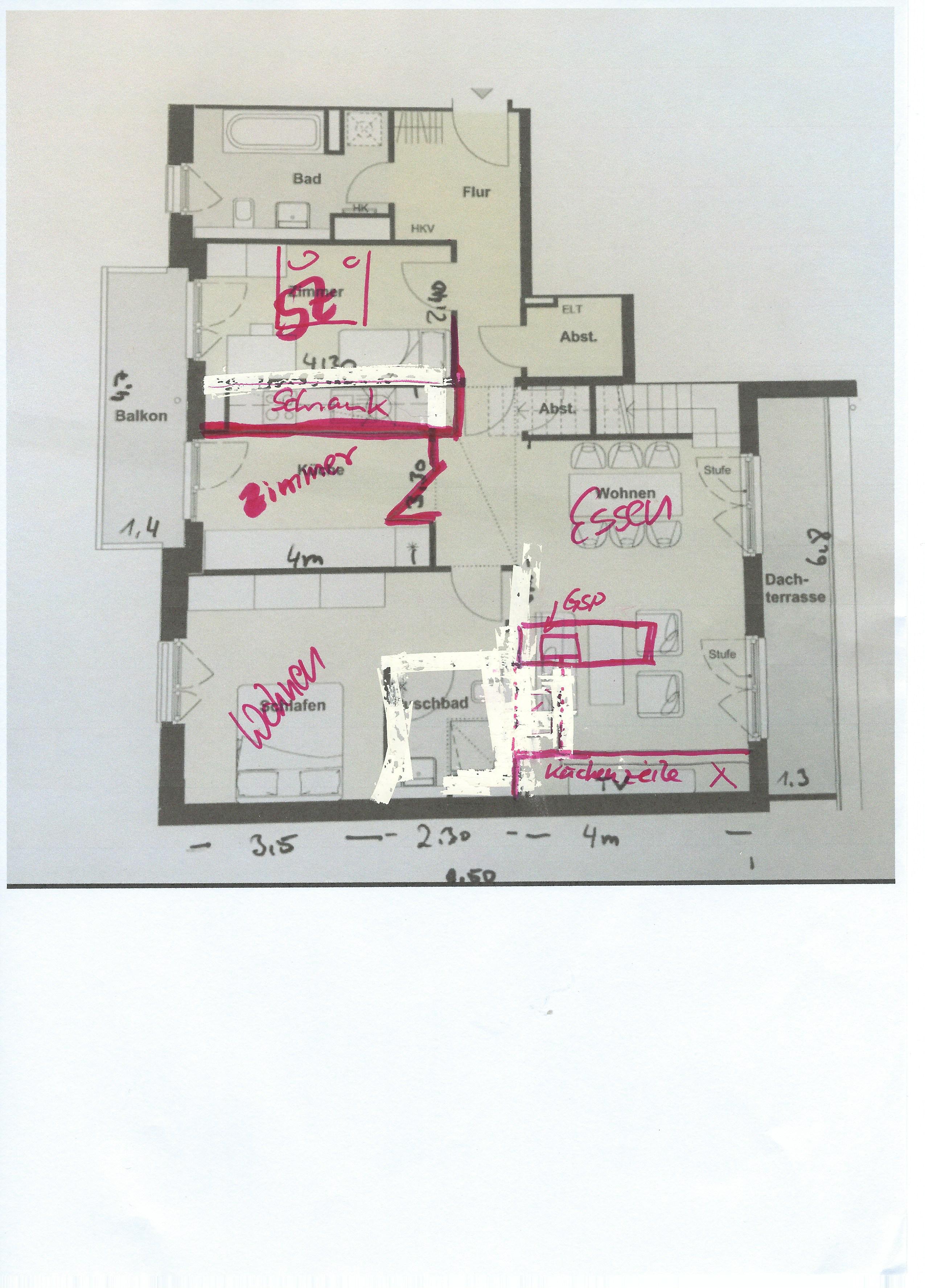 Vorteil der Küchenverlegung ist, daß die dann direkt an der unteren Dachterrasse ist und man für ein Glas Wein nicht durch die ganze Wohnung muß. Und wenn ihr auf der Terrasse auch grillen dürft - noch besser die Küche gleich daneben zu haben!