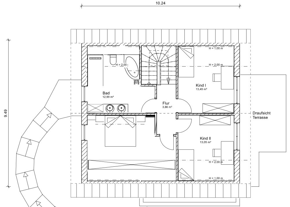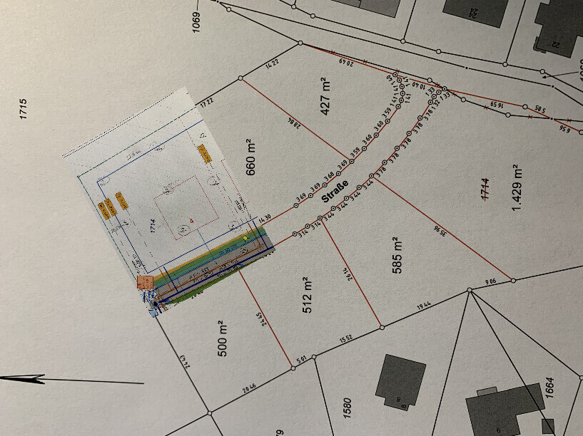 Wo ist denn jetzt die freie schöne Aussicht? Doch nicht nach Südost, wo der einzige Nachbar dicht draufsitzt? Nach deiner Beschreibung und der Grundstückszeichnung mit Nordpfeil dachte ich jetzt, dass die Straße fast im Westen liegt und du nach Nord-Westen ins Tal blickst und nach Nordosten zumindest frei nach Richtung Wald und Wiese? Dann verstehe ich aber nicht, warum die Terrasse da (in der Abstandsfläche?) zum Nachbarn hin "klebt"?