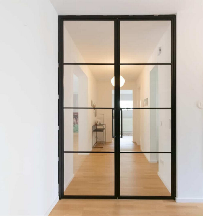 Schwarze Glas-Schiebetür mit Gitterrahmen öffnet zu hellem Flur mit Holzboden und Konsolentisch.