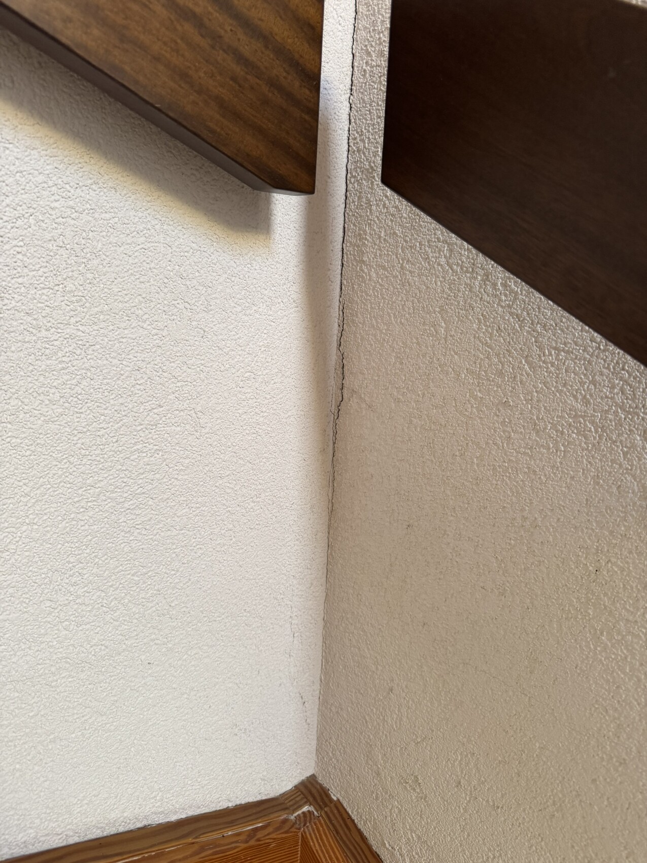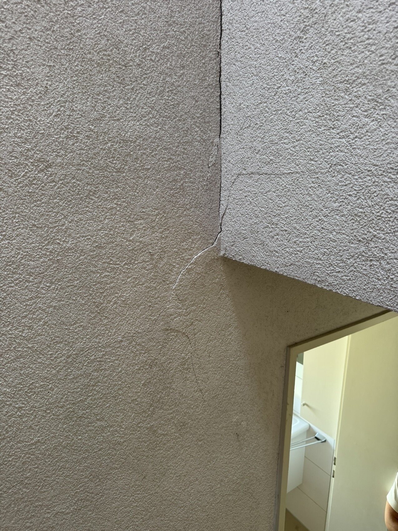 Außenwand-Ecke: weiße und graue Putzflächen, Riss in der Ecke, Holzdecke oben, runde Lampe links
