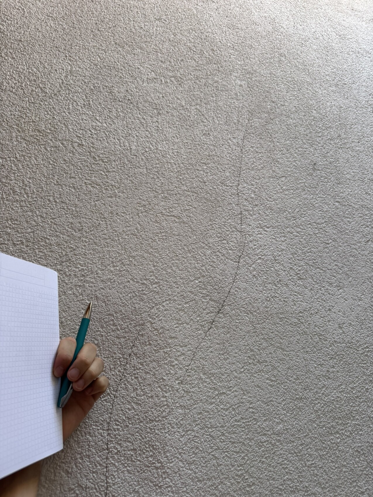 Eine Hand hält Notizbuch mit Graphpapier und türkisfarbenen Bleistift vor Wand mit Riss.