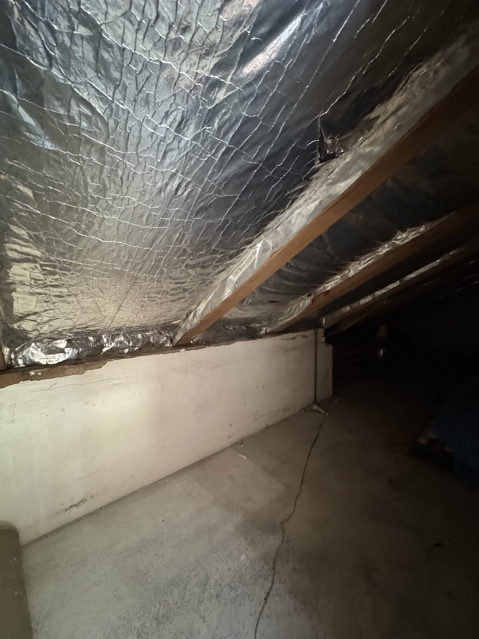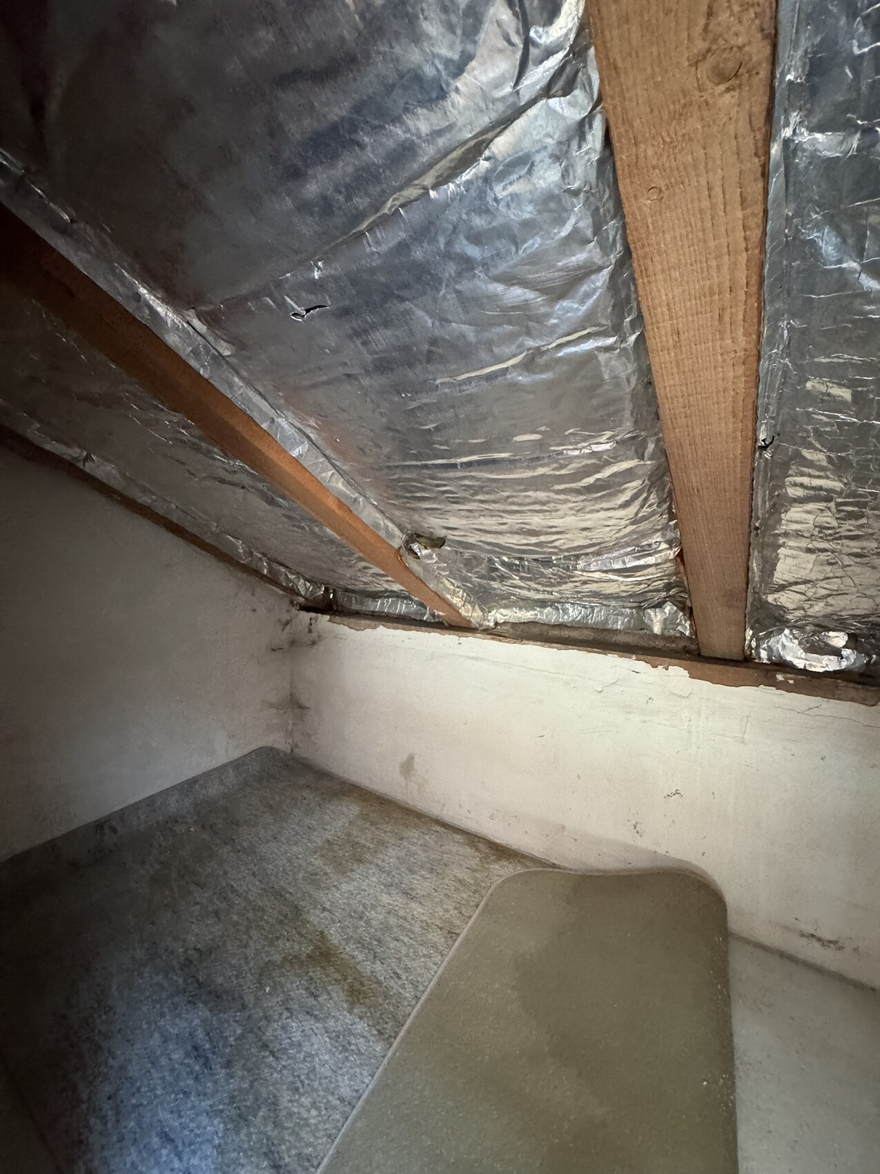 Dachboden mit silberner Dämmfolie an der Decke, Holzbalken, schmaler Gang und Riss im Betonboden.