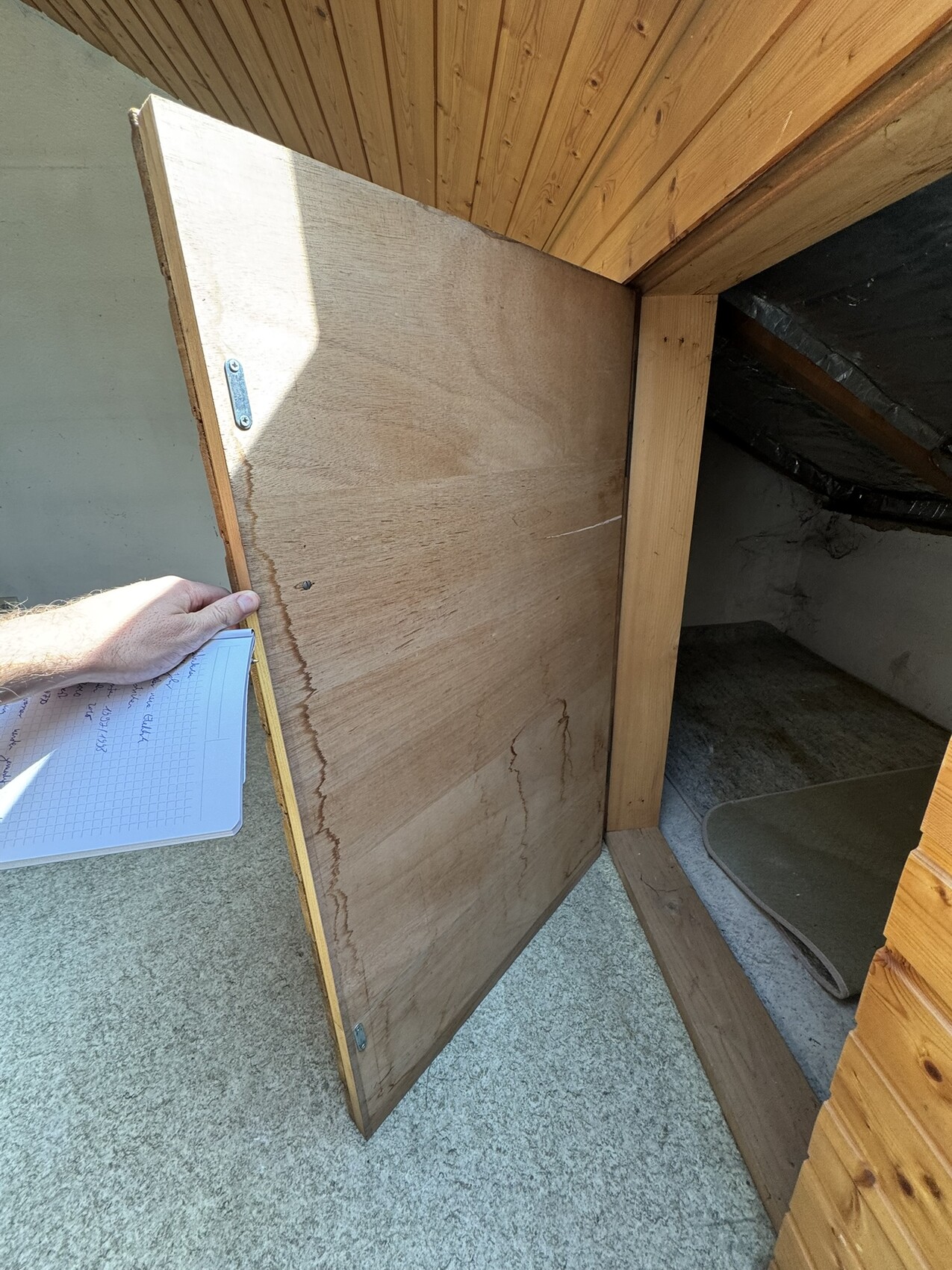 Hand hält eine offene Holzplatte als Tür im Dachboden; sichtbare Holzwand und Teppichboden