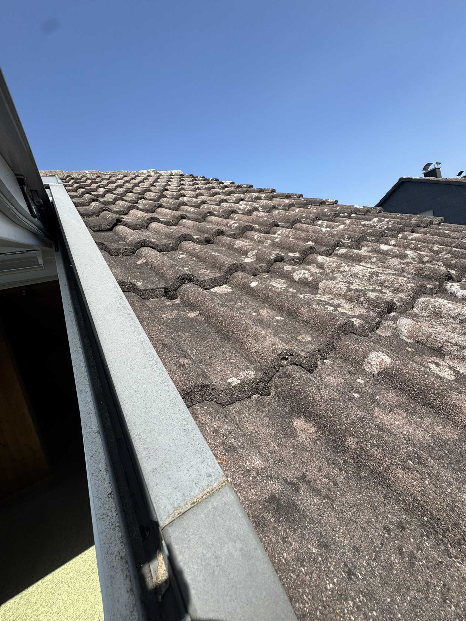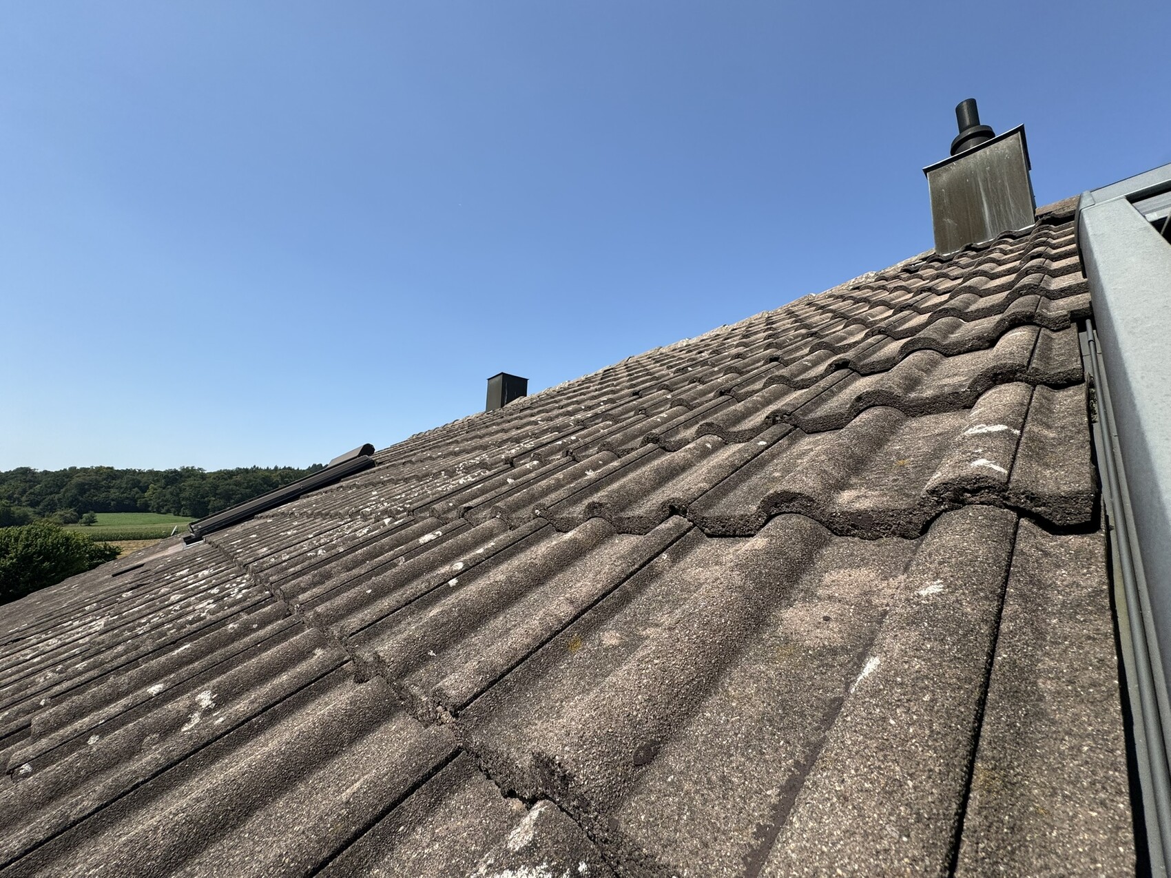 Draufsicht von der Traufe auf braunes, gewelltes Tonziegeldach mit Moosflecken und blauem Himmel