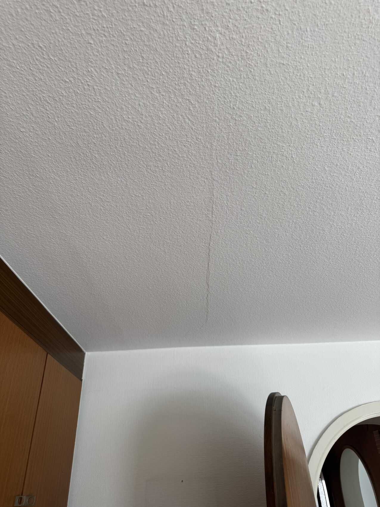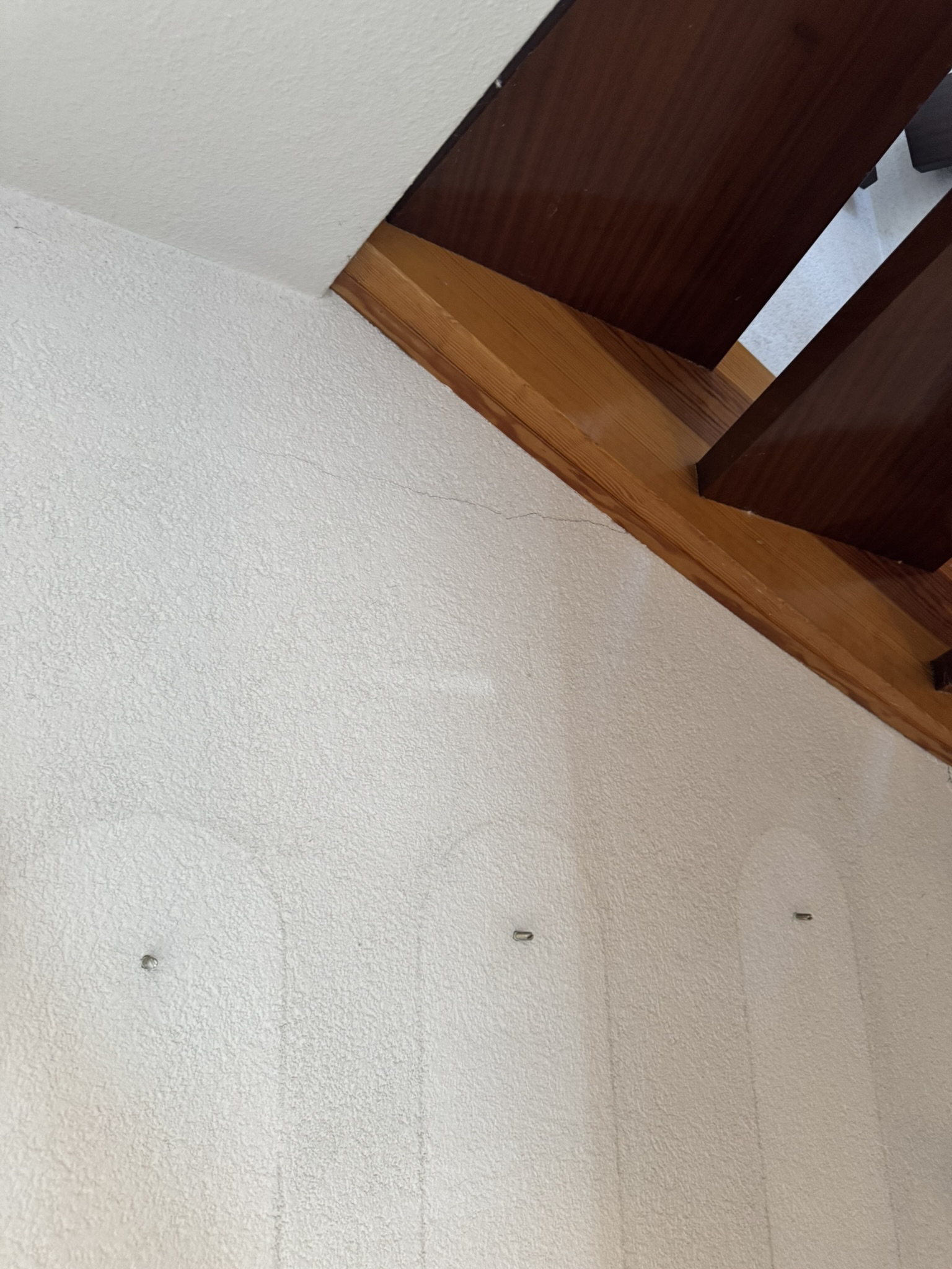 Weiße, texturierte Zimmerdecke mit feiner Haarriss; Ecke mit Holzelementen sichtbar.