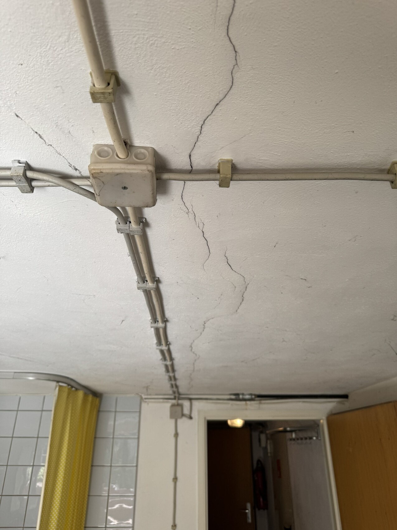 Decke mit Rissen, Kabelkanäle und Verteilerdose; Badezimmer mit gelber Duschvorhang und offener Tür.