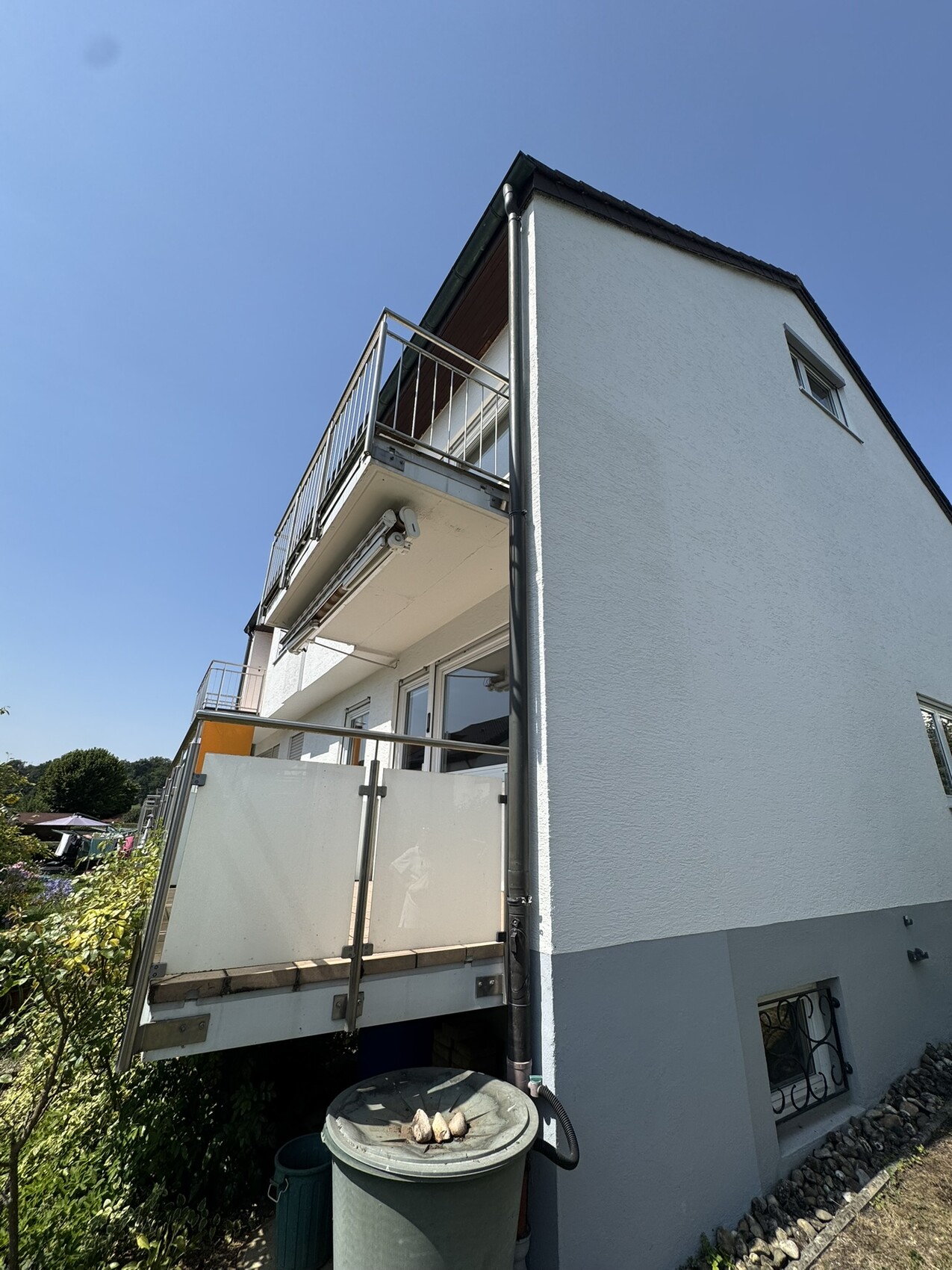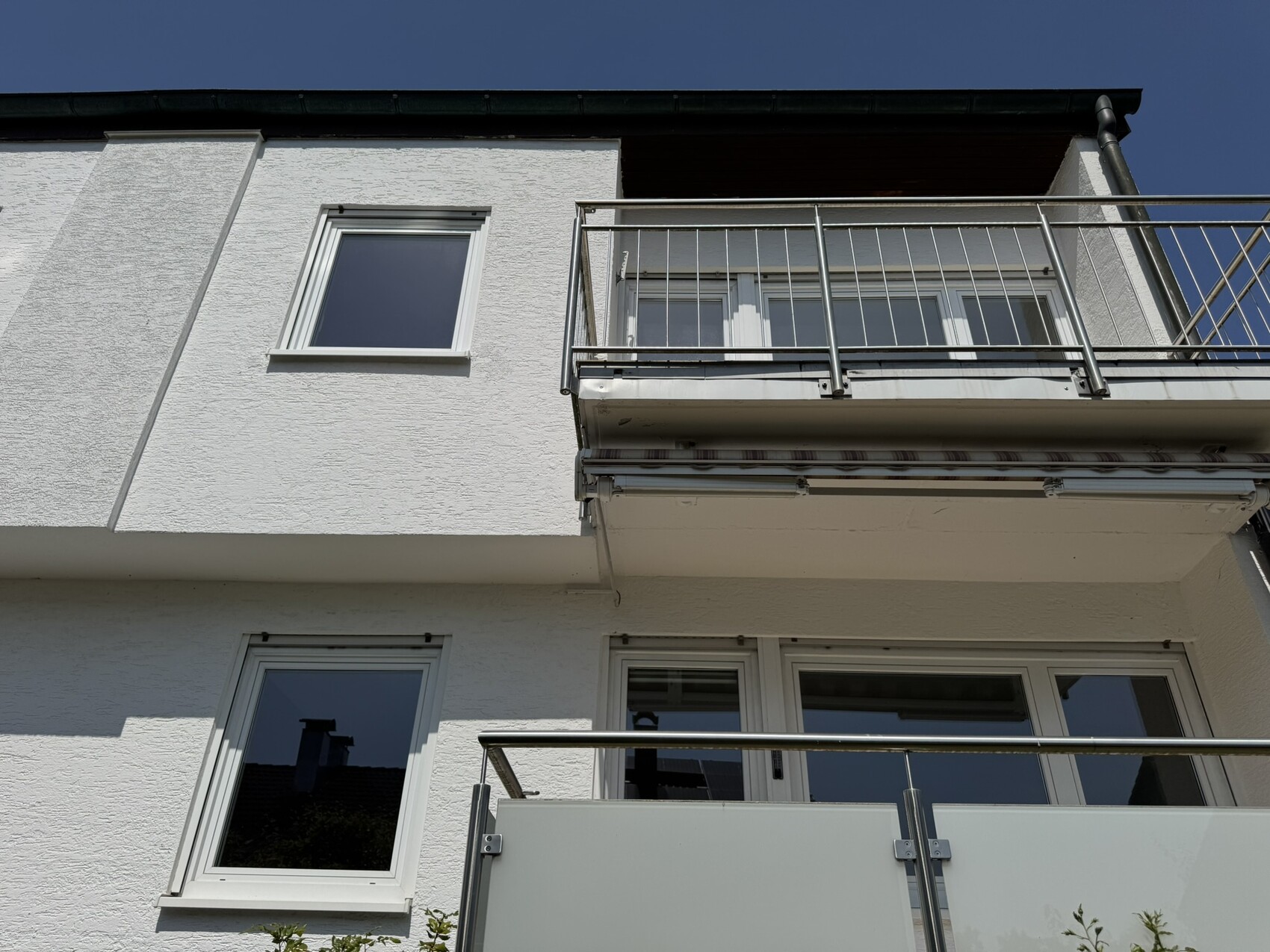 Weiße Gebäudefassade mit Balkon und Fenstern vor blauem Himmel.