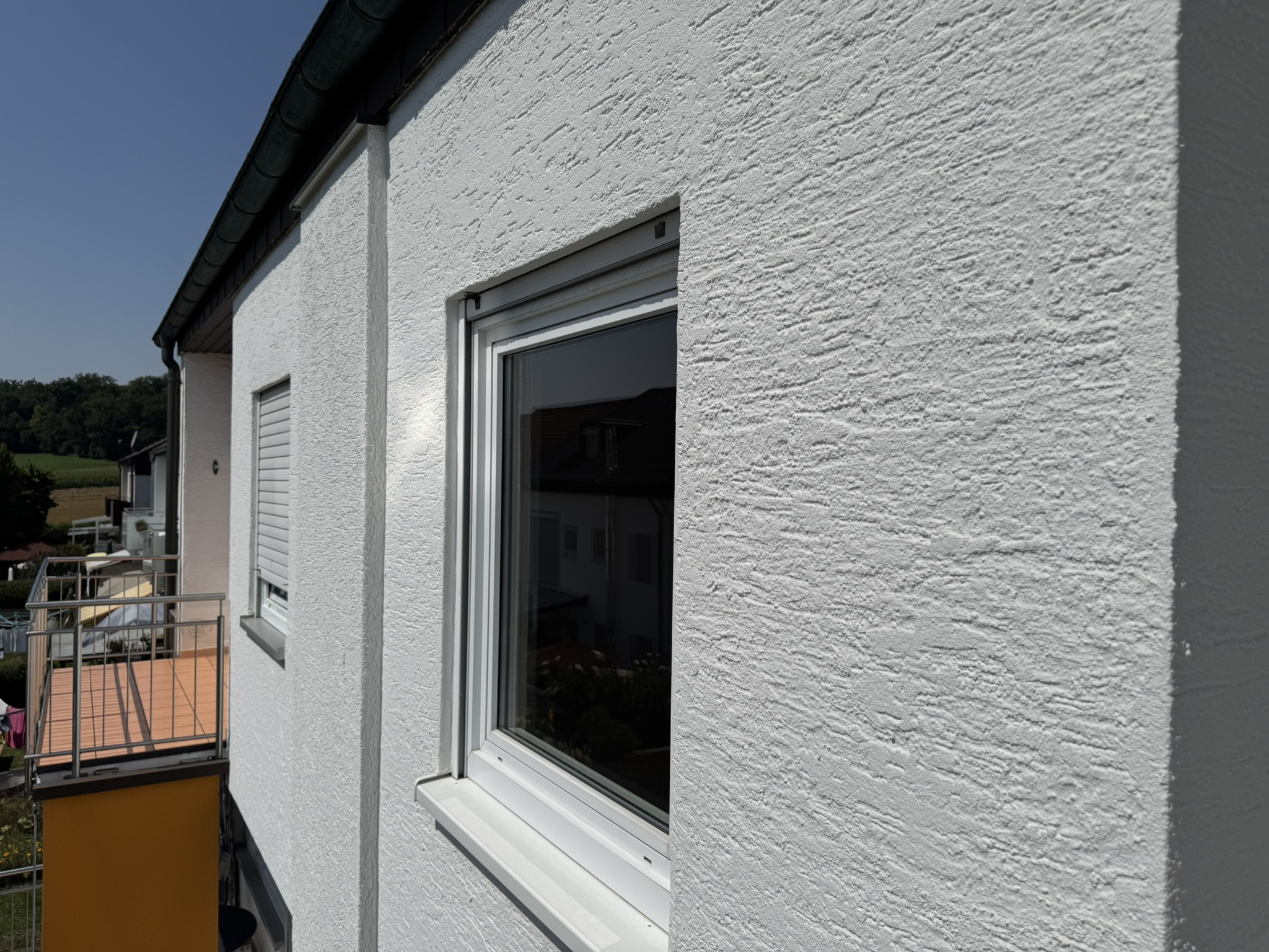 Weiße verputzte Hauswand mit Fenster und Balkon samt Geländer; blauer Himmel.