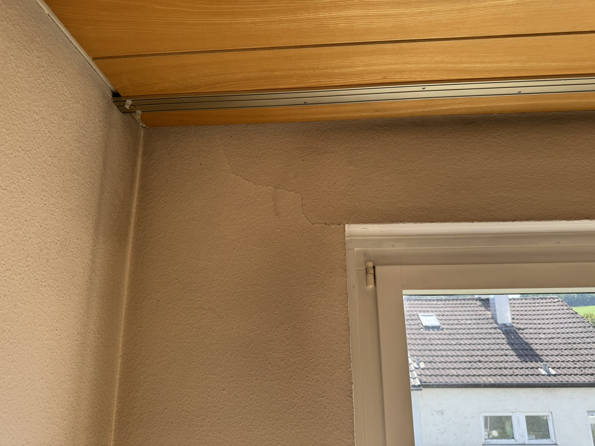 Ecke eines Zimmers mit Wandriss unter Holzdecke; Fenster mit Blick nach außen sichtbar.