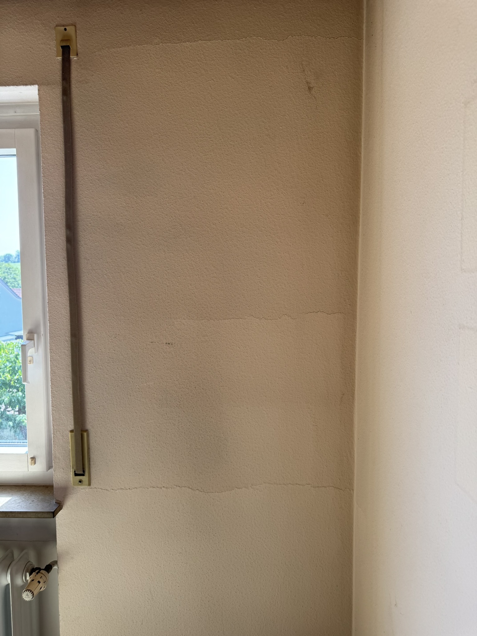 Wand im Innenraum mit vertikalem Leitungsrohr links, Fenster links und Heizkörper unten.