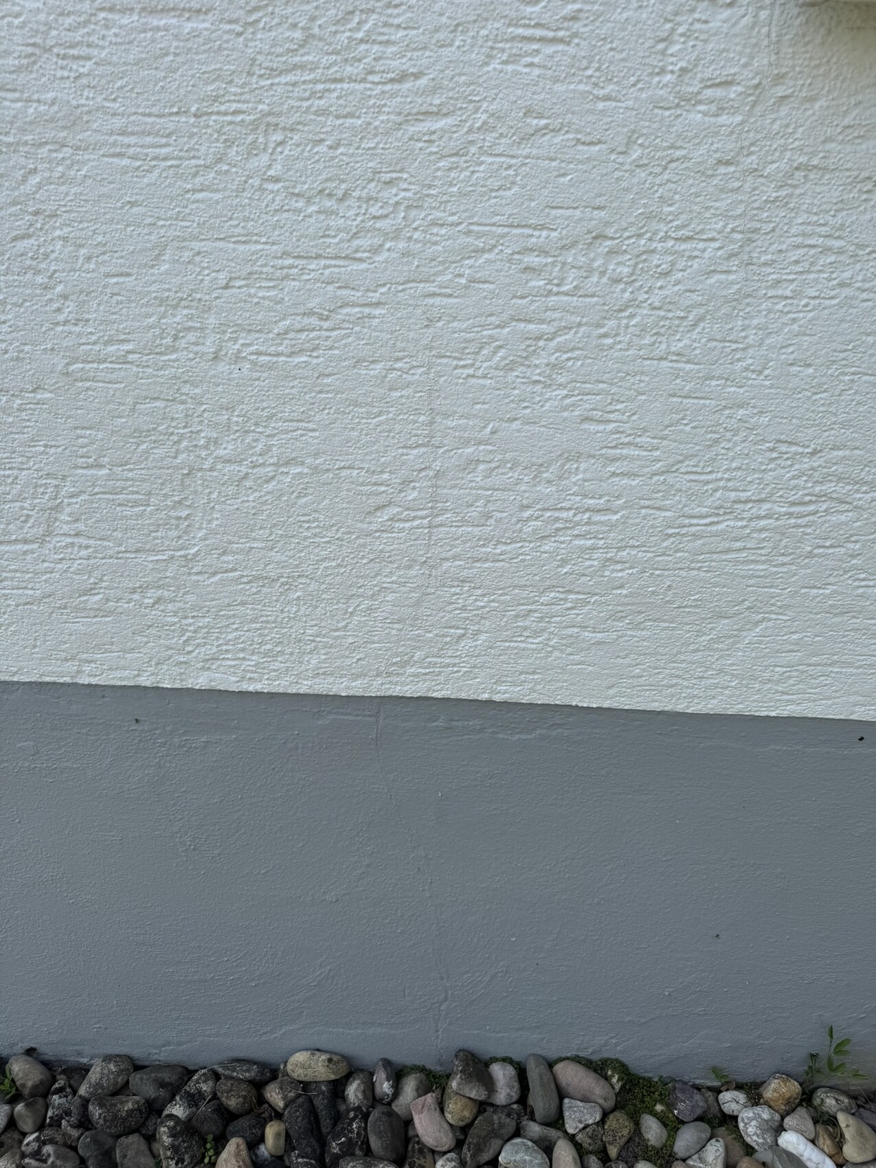 Weiß grob texturierte Wand oben, graue glatte Fläche unten; schräge Trennlinie, Kiesel am Boden.