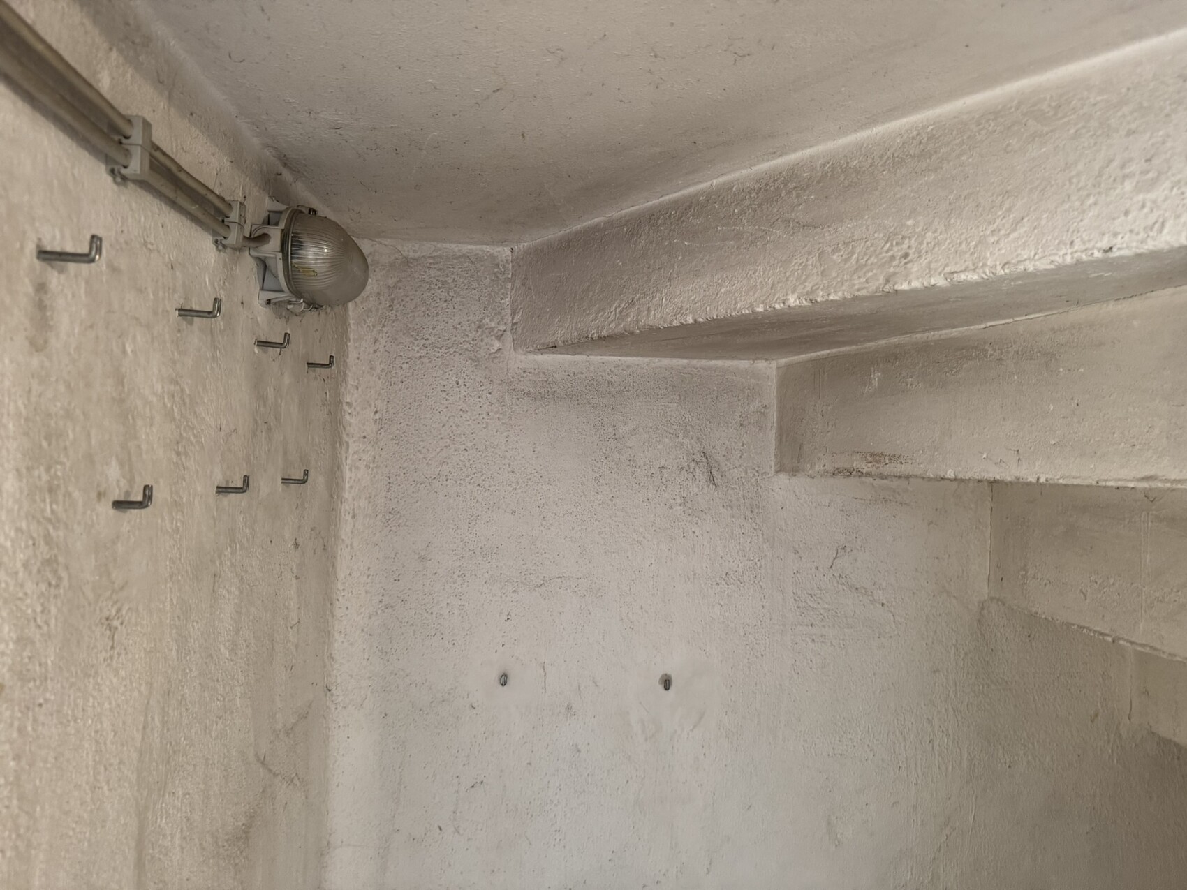 Kellerraum aus Beton mit rauer Wand, runde Glaskuppellampe und viele Wandhaken.