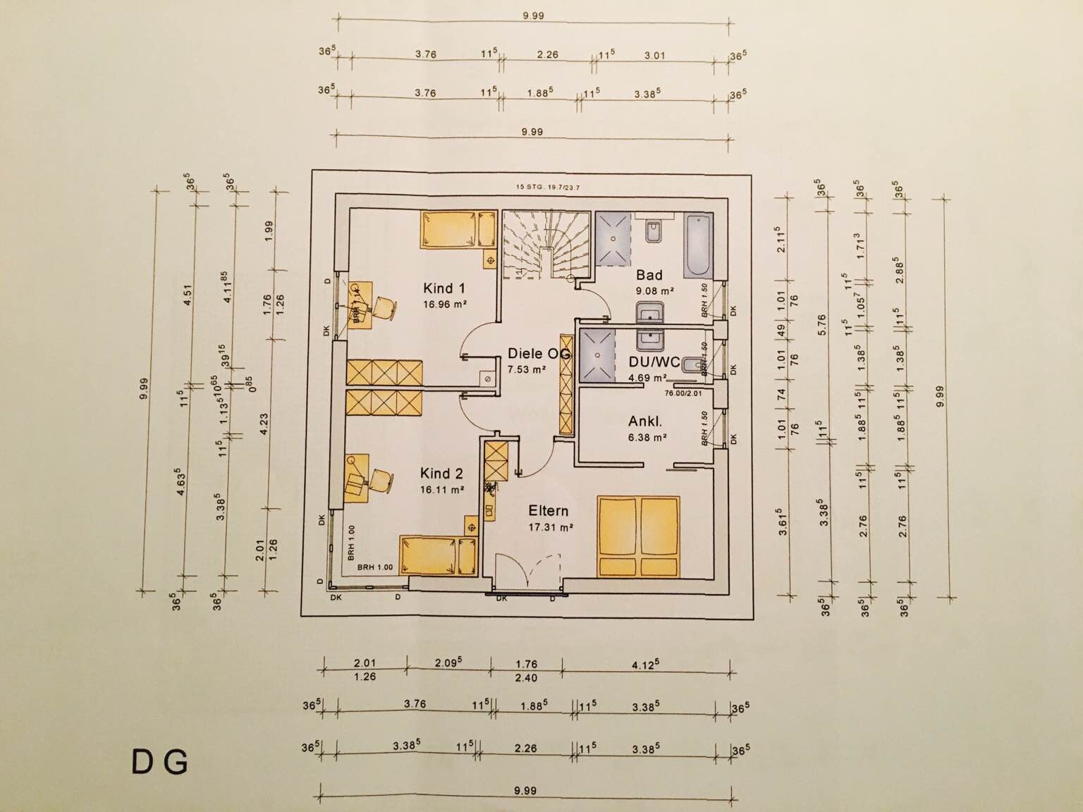 OG - Eltern/Bad/Ankleide finde ich ungünstig zueinander. Ankleide hat wenig Stellfläche, Weg ins Bad weit und alles immer am Bett vorbei. Dafür wird es am Bett vorbei eng und die Ankleide ist mit 188 cm auch zu eng.