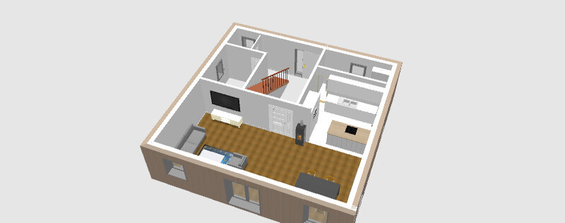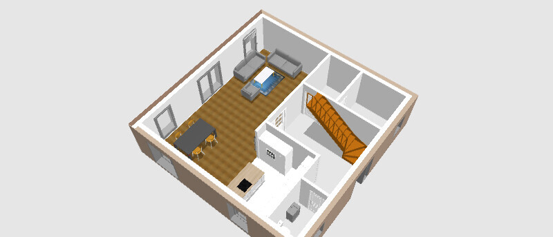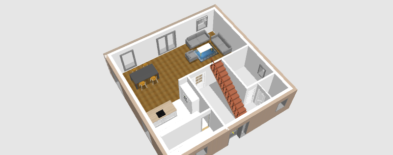 Isometrischer Grundriss eines kleinen Hauses: Wohnzimmer mit TV, Sofa; Küche; Schlafzimmer; Treppe.