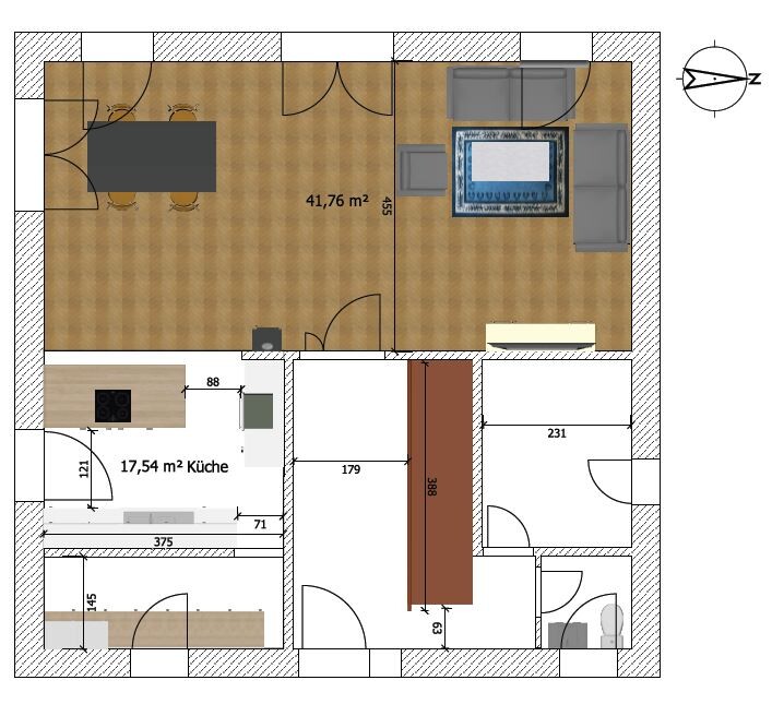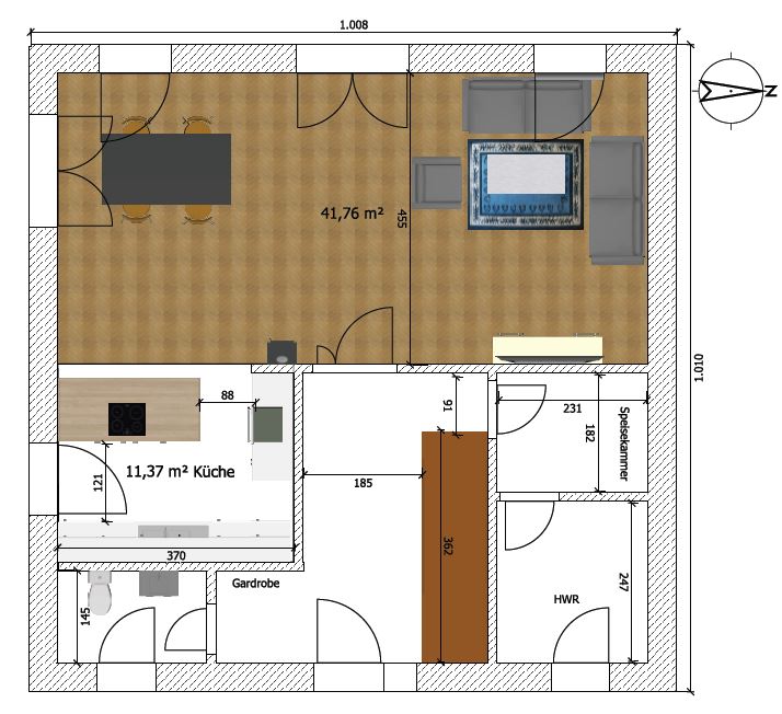 Die schiefe Wand mit der Tür macht das etwas schwierig finde ich. Du hast unten Küche und Essplatz gequetscht, dann kommt eine riesige freie Fläche. Das würde ich neu aufteilen. Leider sind kaum Maße in deinem Plan. Ist es dein eigener Entwurf oder wird schon so gebaut?
