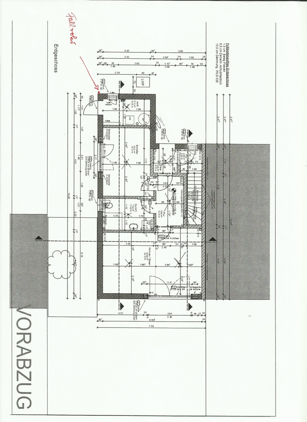 es geht um ein im Bau befindliches 2-Fam.-Reihenendhaus, bei dem eine Betontreppe (EG-OG) eingebaut wurde. Der Bereich unter der Treppe ist durch eine Mauer von der EG-Wohnung getrennt. Die Mauer ist oben noch nicht vollständig, so dass es möglich war ein Foto vom Bereich unter der Treppe zu machen, um festzustellen, ob sich dort Wasser befindet, das durch das noch vor kurzer Zeit nicht geschlossene Dach eindringen konnte. Wasser konnte ich nicht entdecken, doch habe ich festgestellt, dass die vertraglich vereinbarte Bitumen-Schweißbahn dort fehlt. Der relevante Bereich ist nördlich 12,4 , südlich 6,2 , östlich 5,3 und westlich 2,0 Meter vom Ende der Bodenplatte entfernt. Im Bodengutachten wurde kein Grundwasser festgestellt, jedoch sind niederschlagsbedingte Aufstauungen möglich.