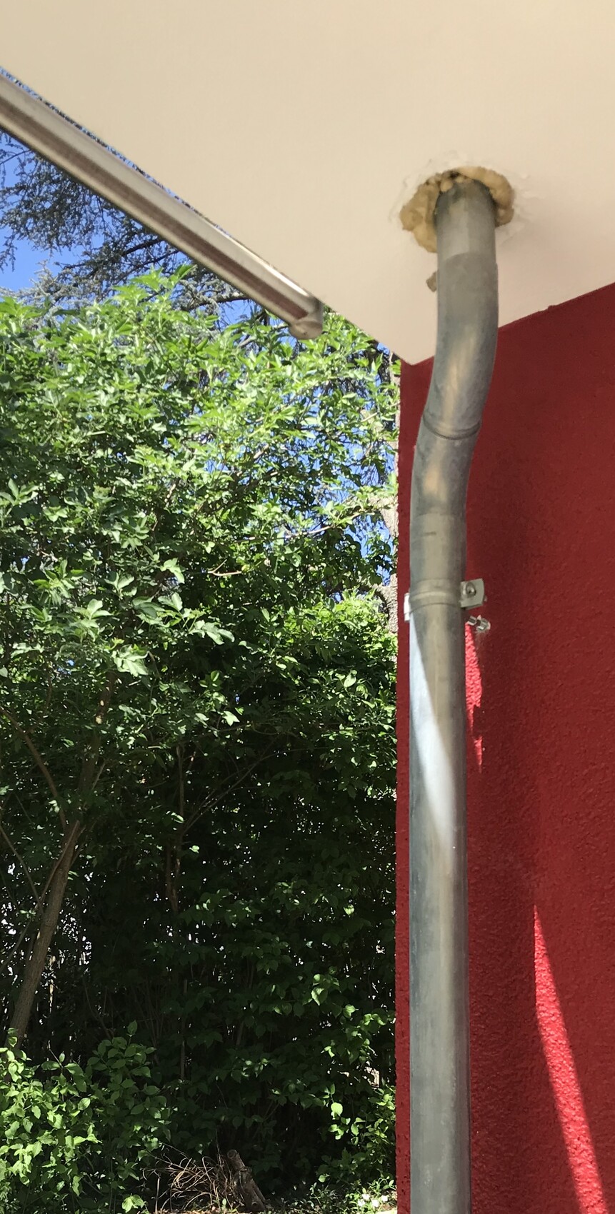 Außenbereich: senkrechtes Metall-Fallrohr an roter Wand, unter weißer Decke, grüne Hecke und blauer Himmel.