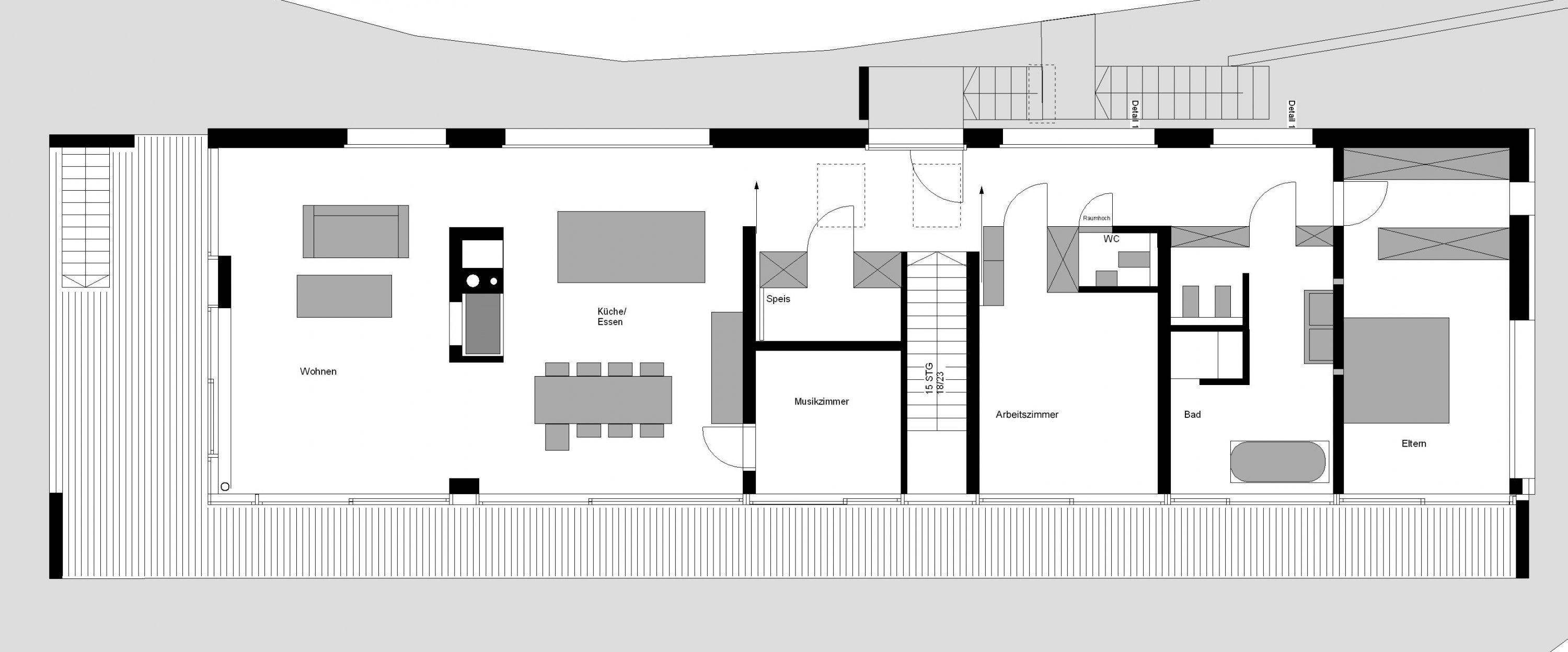 Der Kinderbereich soll über dem Elternbereich liegen, wobei hier der links liegende Bereich für die Eltern der Bauherren gemeint ist.