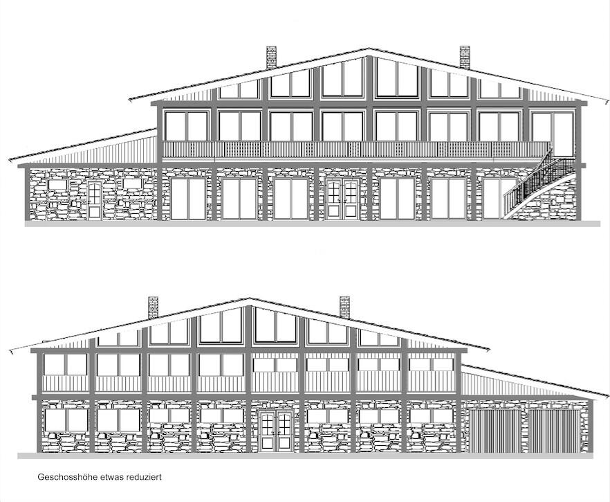 Anbei übrigens zwei soeben freigegebene Ansichten der Häuser. Kritikern zuvorkommend: Dies sind Vorabskizzen die nicht den Anspruch haben, perfekt zu sein. Hier haben wir versucht, unterschiedliche Kniestockhöhen wirken zu lassen: Im oberen Bild 2,88m, im unteren 2,58m. Man sieht aber in der Gartenansicht den Balkon mit Treppe, die Natursteinverkleidung und die noch geteilten Fenster, die es hoffentlich bald nicht mehr sind. Noch scheint es ein Problem zu sein.