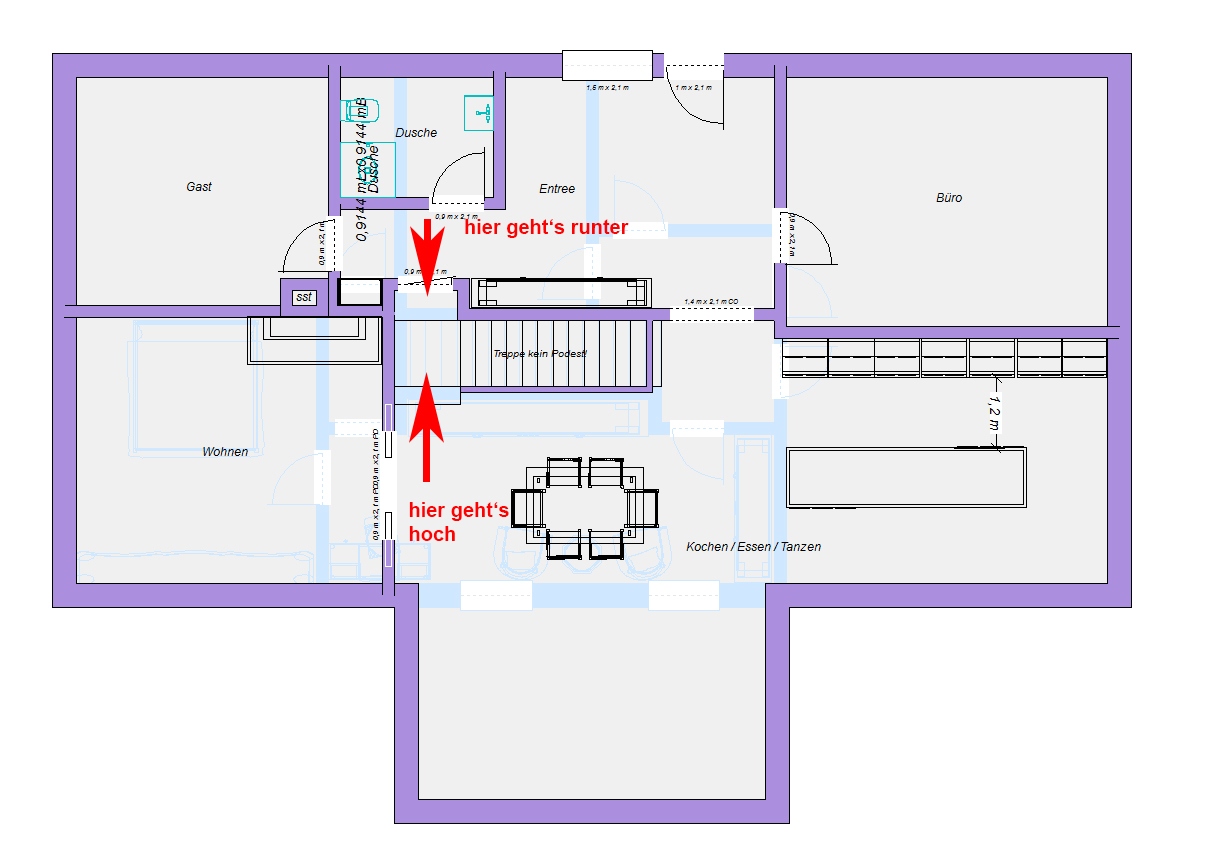 Zu der Treppe noch eine Frage: Wenn da kein Podest ist, aber das ja der untere Teil sein sollte, muss man dann nicht noch 1m tief frei halten, wo jetzt die Wand ist? So ganz klar wird mir das noch nicht, wie man da rauf kommt.. und die Kellertreppe geht dann von der Speisekammer aus runter? Oder genau andersherum, aber dann steht man im OG genau vor der wand, wenn man hochläuft?
