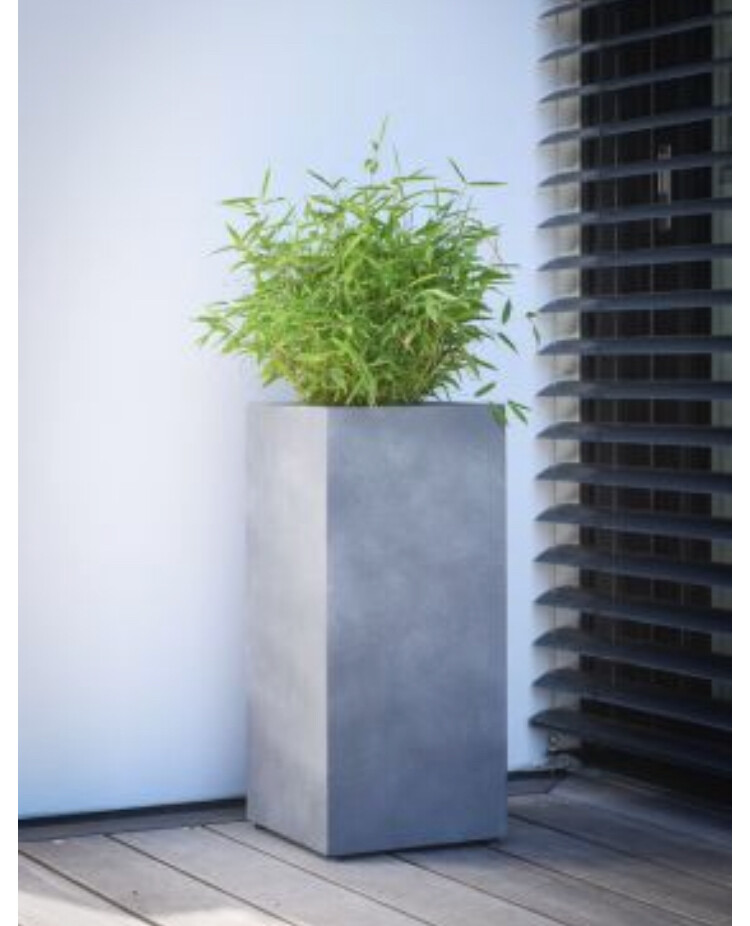 Grüne Pflanze in einem hohen grauen Pflanzkübel auf Holzdielen neben einem dunklen Rollladen.