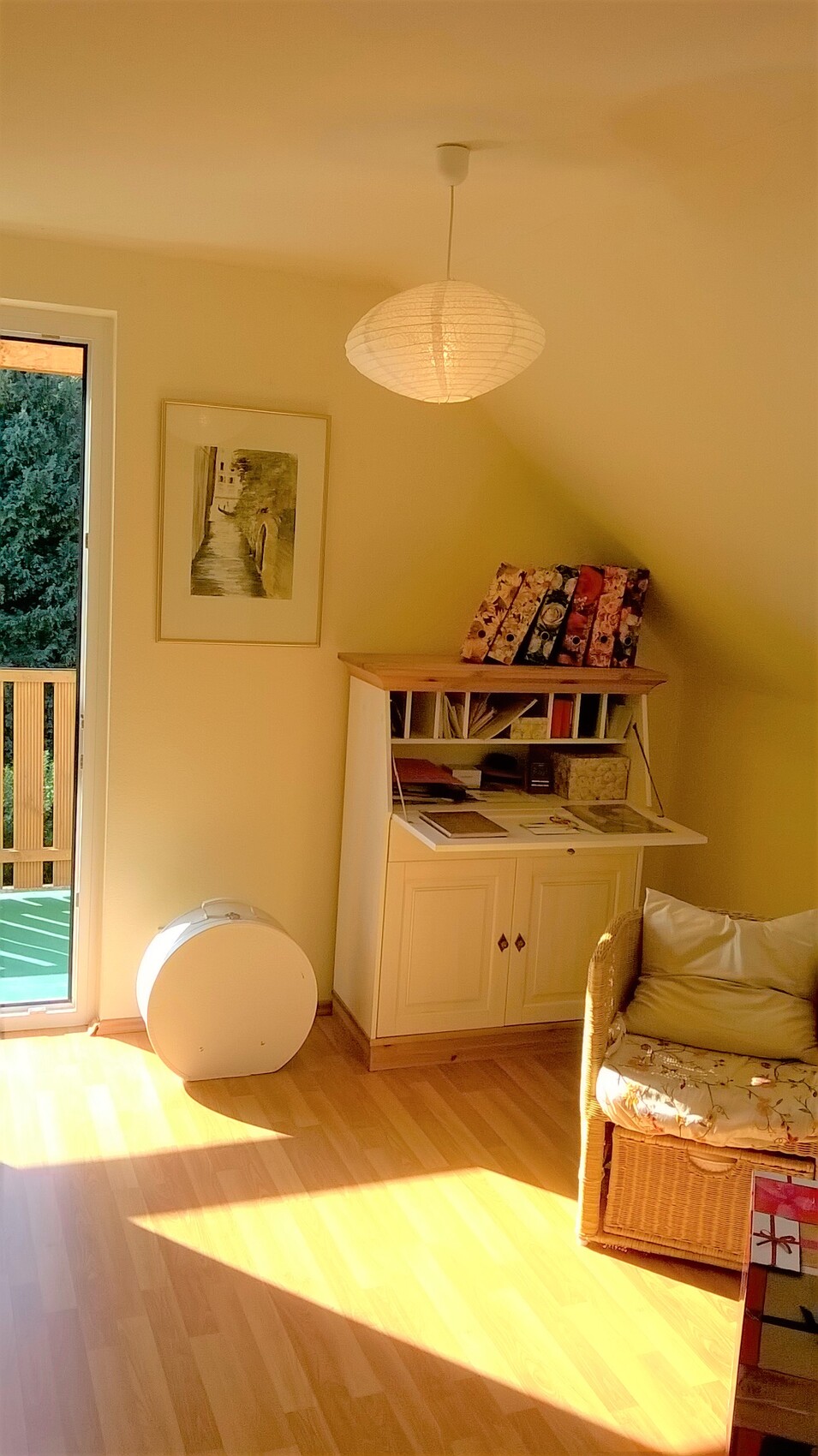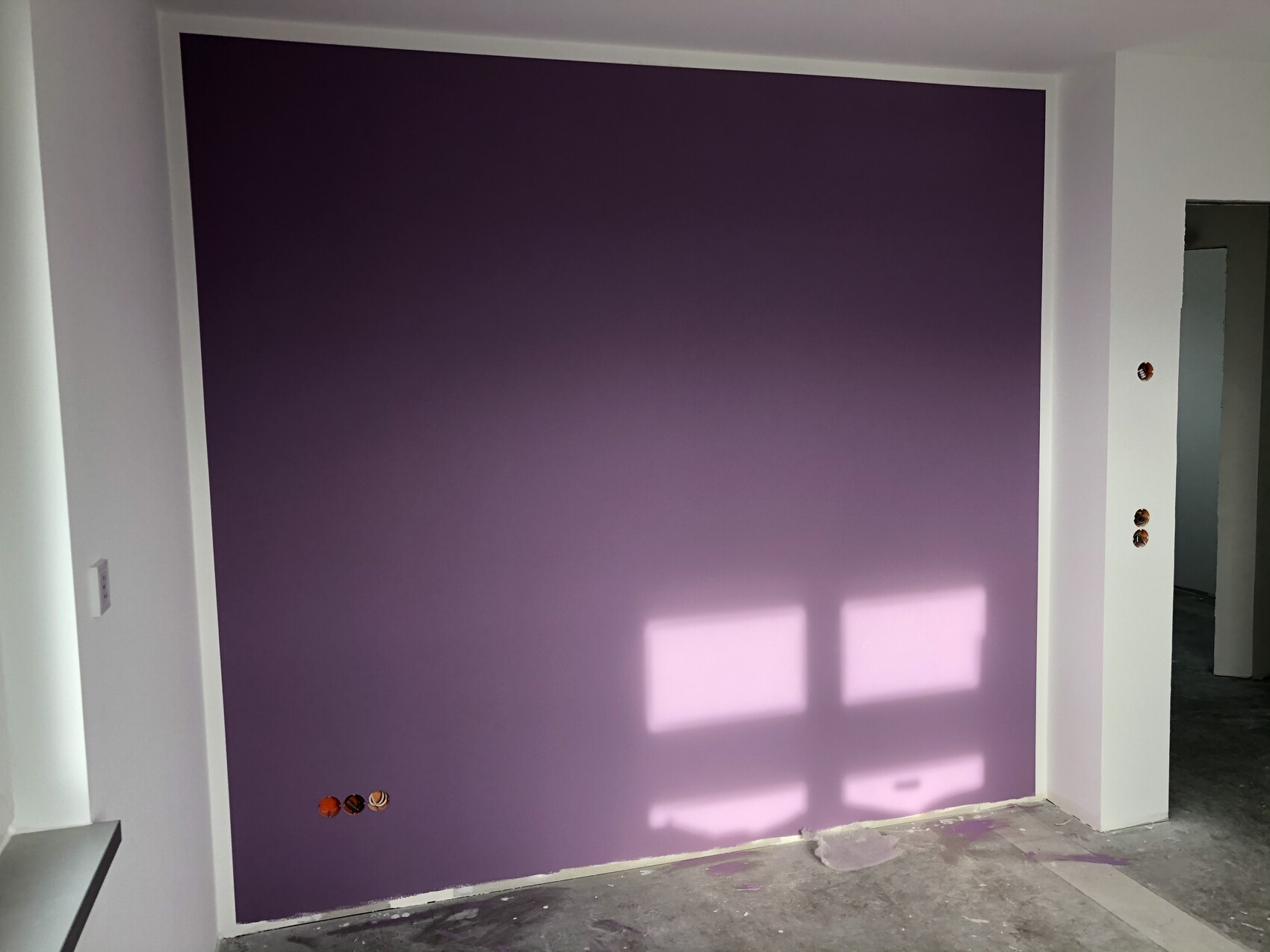 für was Violett und Blau im OG sind sollte klar sein Die Farben haben die Kinder auch selbst herausgesucht. Das kräftige rot wird das Büro von meiner Frau, da sind die restlichen Wände mit einem ganz leichten Grau gestrichen, sieht man ganz gut wenn man auf den weißen Türrahmen schaut.