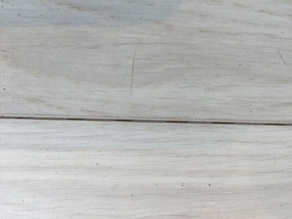 Besonders ärgerlich ist, dass die Kratzer stark sichtbar sind, da die weiße Trägerplatte unter der Holzoptik sofort ersichtlich wird.