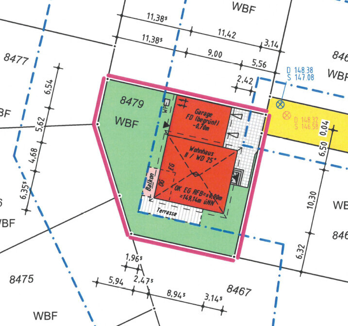 Nach meiner Berechnung wäre der Höhenunterschied etwas 0,7m. (Garagenhöhe 148,44, Erdgeschosshöhe 149,14, siehe Schnitt, GW Max zwischen 145,26-146,20) Das wären sicherlich 4-5 Treppenstufen, oder? Der Abstand zum Grundstück des Nachbarn beträgt 6,32 Meter, abzüglich der Terrassenbreite von 2,65 Meter wäre der Restabstand 3,67 Meter und ich glaube da hört dann auch die Toleranz des Bebauungsplanes auf.