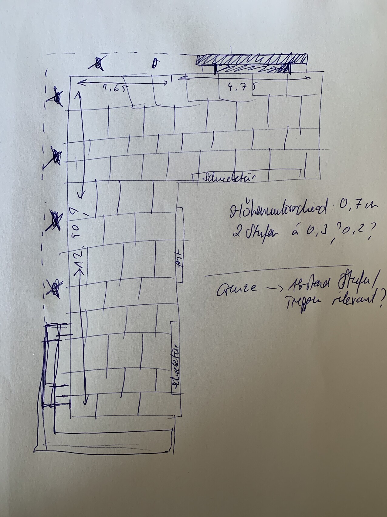 Eine andere Idee war es mit Treppenstufen einen Abgang zu bauen. Problem dabei: Dann wären wir wahrscheinlich wieder sehr nahe am Grundstück der Nachbarn.