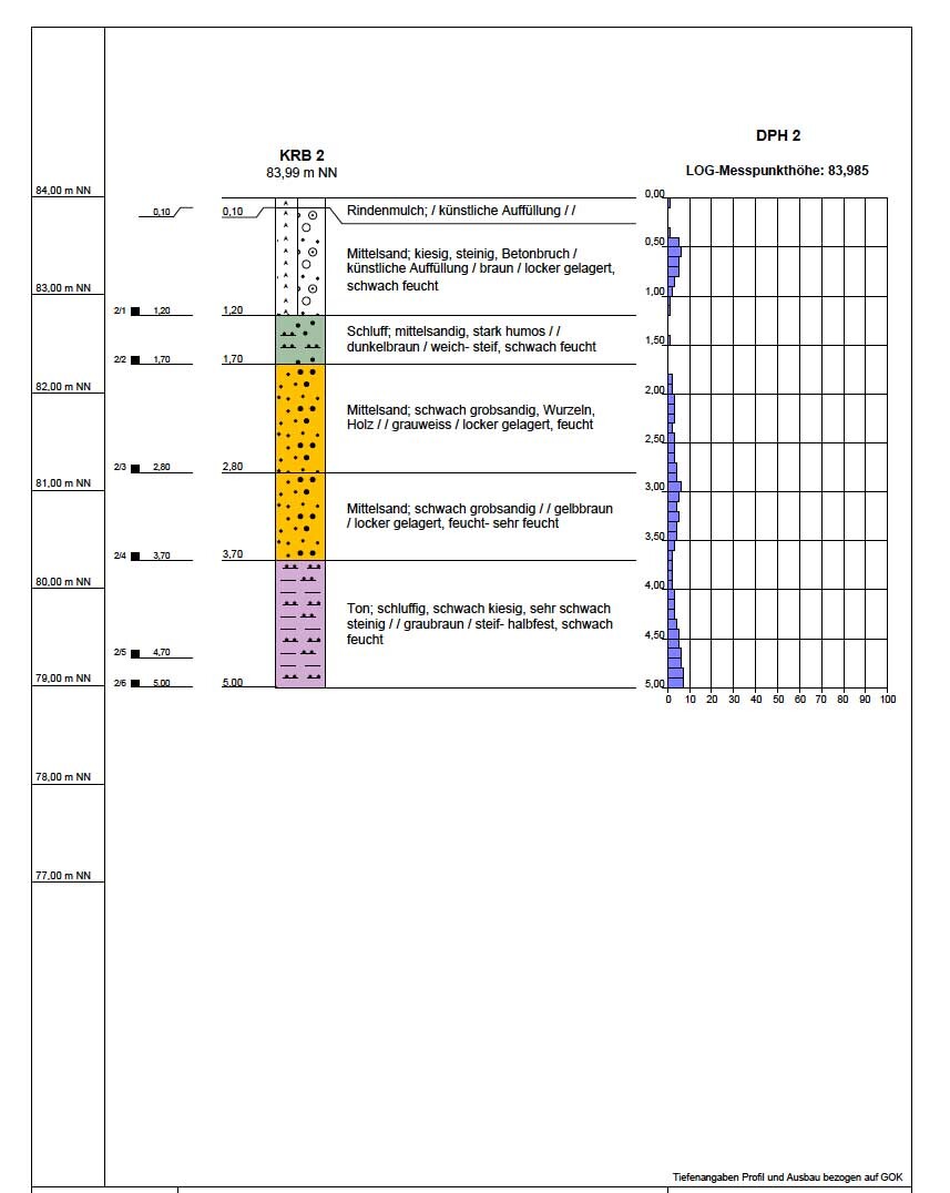 Da der obere Teil des Bodenprofils aus aufgefülltem Bodenmaterial mit Bauschuttanteilen besteht, sollte die Gründung über dem derzeitigen Geländeniveau als Hochparterre in Betracht gezogen werden. Hiermit könnte ein kostenintensiver Bodenabtrag vermieden werden.