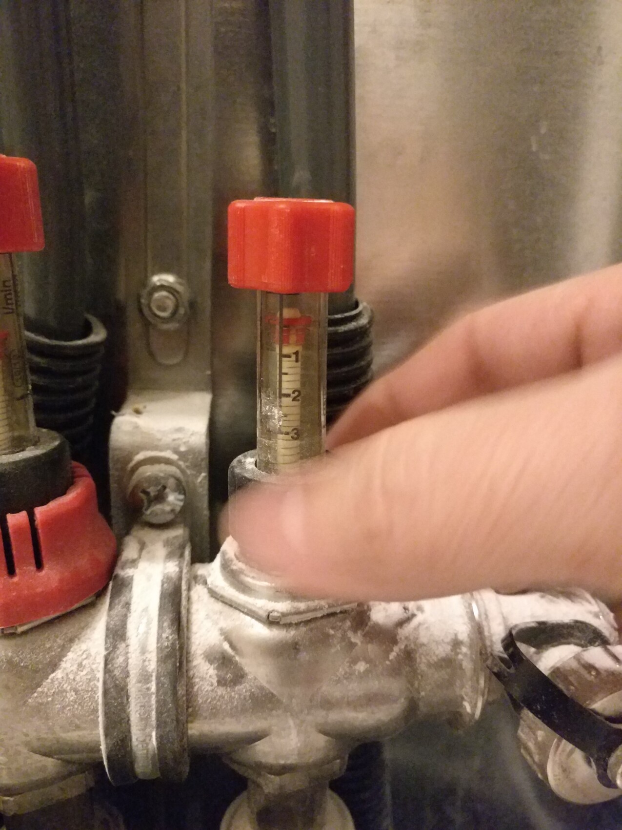 Am Durchflussröhrchen unten das rote Teil hochziehen. Darunter befindest sich ein schwarzes Konterrädchen, das lösen, dann kannst du oben an dem Durchflussmesser auf oder zu drehen.