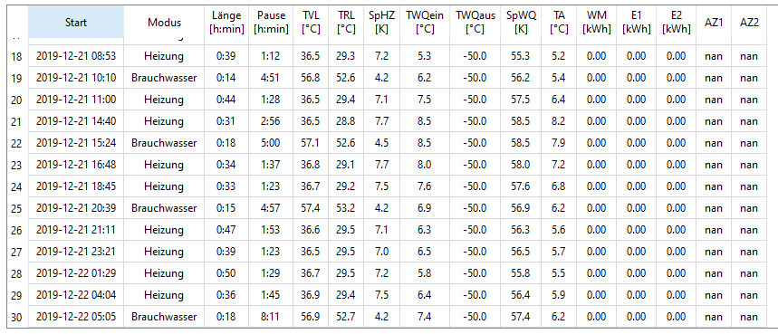 Tabelle der Heizungs- und Brauchwasserbetriebszeiten mit Start, Modus, Dauer und Temperaturen