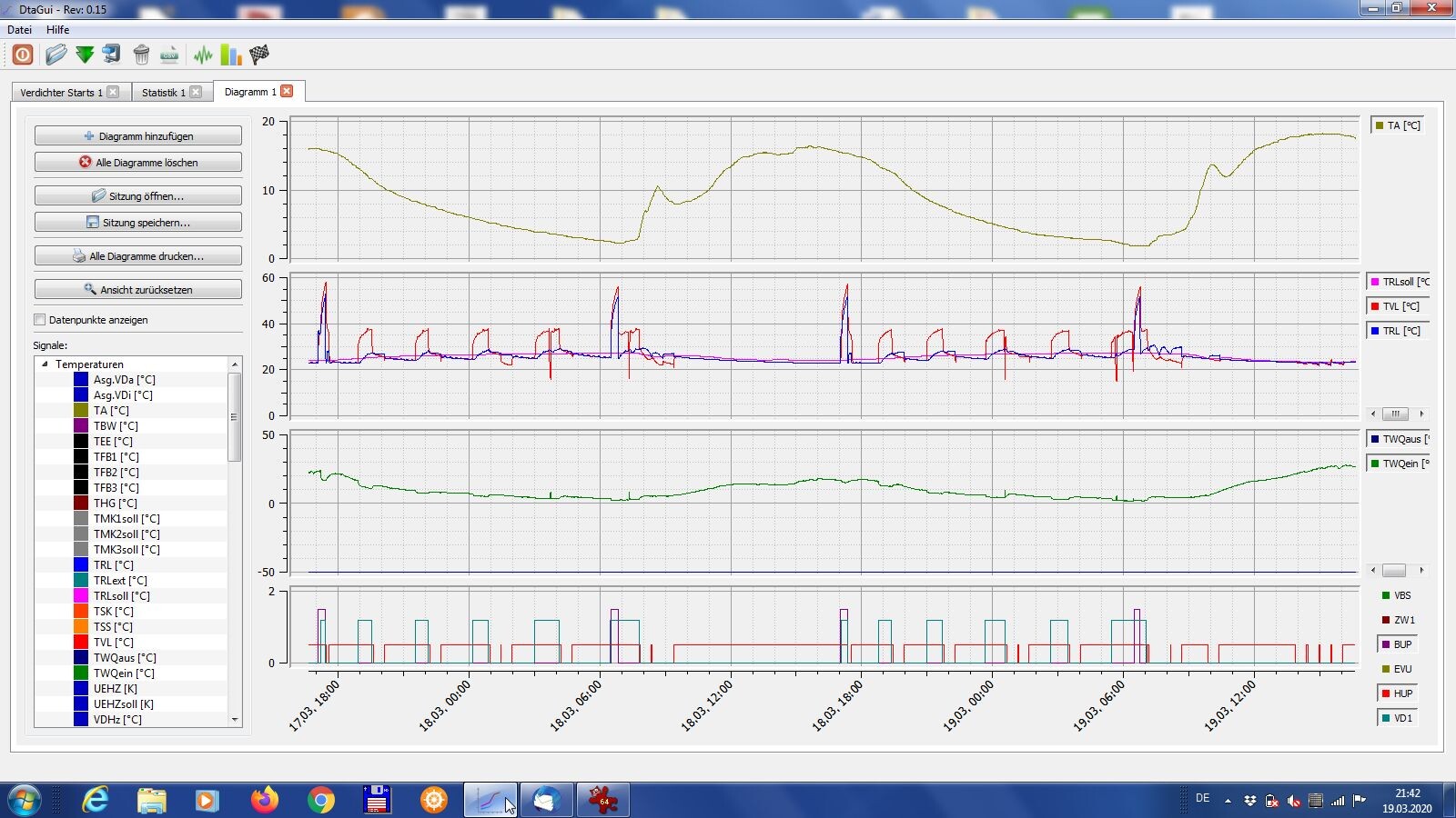 Wenn im DTA korrekte Daten aufgezeichnet sind, wovon ich ausgehe, läuft die Wärmepumpe eigentlich korrekt. Der Verdichter ist seit ca. 07:00 Uhr aus. Auch die Temperaturverläufe von Warmwasser, Vorlauf, Rücklauf, Heizgas sind unauffällig und plausibel. Ebenso scheinen die Pumpen normal zu laufen (zumindest durch die Luxtronic korrekt angesteuert). Der Temperaturverlauf spricht auch für korrekt angesteuerte und arbeitende ZIP, HUP, ZUP. Was das Display anzeigt, kann ich nicht nachvollziehen, zumal die angezeigte Temperatur zu keiner im DTA auslesbaren Temperatur passt.