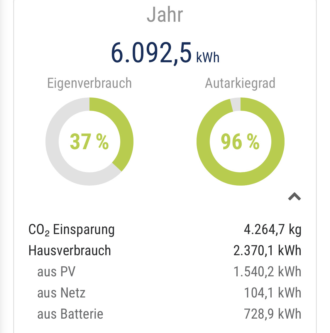 Jahreswert 6.092,5 kWh; Diagramme zeigen Eigenverbrauch 37%, Autarkie 96% und CO2-Einsparung 4.264,7 kg.