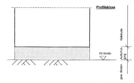 Der GSV hat eine Profilskizze gemacht (siehe Profillskizze.jpg) und ist der Meinung, dass der Bodengutachten von zweitrangiger Bedeutung ist, da das Gebäude nicht unterkellert ist und das Grundstück aufgeschüttet wurde. In diesem Fall ist von der Beanspruchungssituation “Bodenfeuchtigkeit” auszugehen.