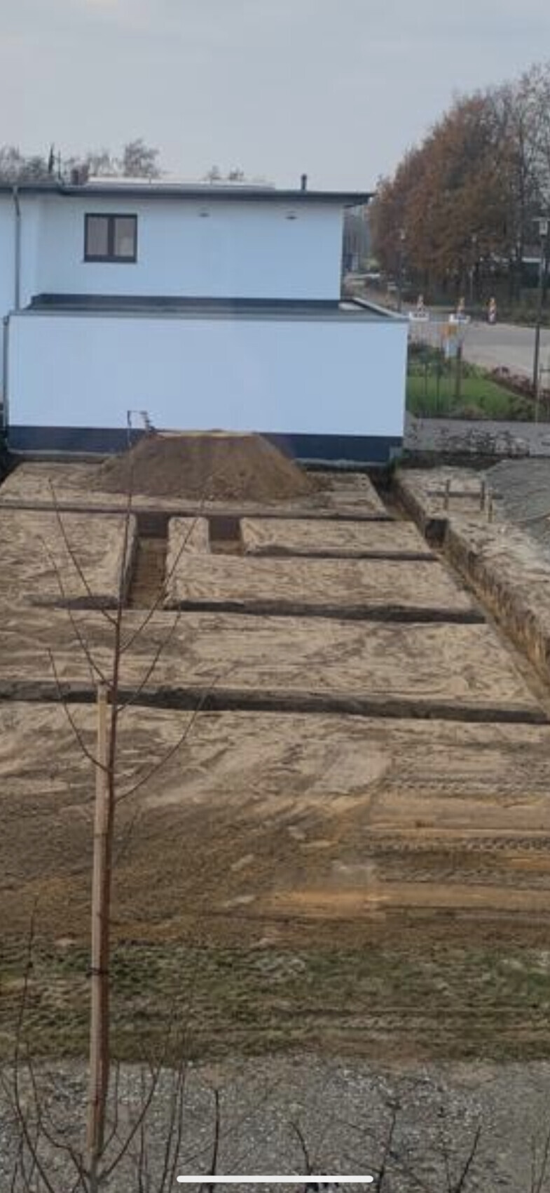 kann das auf dem Foto nichtgenau erkennen, aber das streifenfundament wird normalerweise bei diesem Aufbau über die bodenplatte ragen. Der Vormauerstein wird dann direkt auf das Streifenfundament gesetzt.Wenn‘s so wäre, müsste doch aber der Versatz zur Garage erkennbar sein oder?Hier sind noch ein paar Fotos der des Verlaufs: man sieht bei den Streifenfundamenten einen Versatz wie er passen könnte und ab der Aufsatzmauer, die zur Abschirmung gegen das Ersreich dient, nicht mehr.