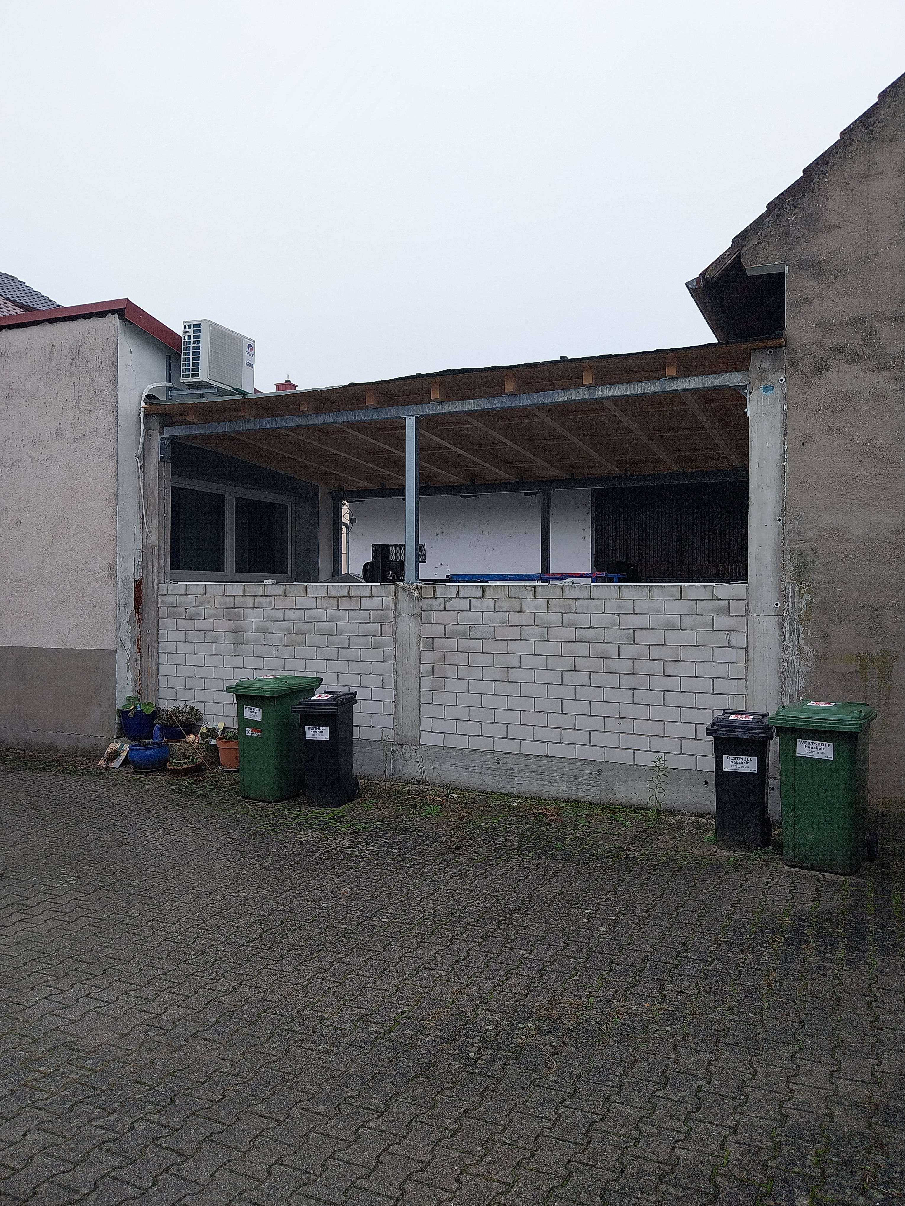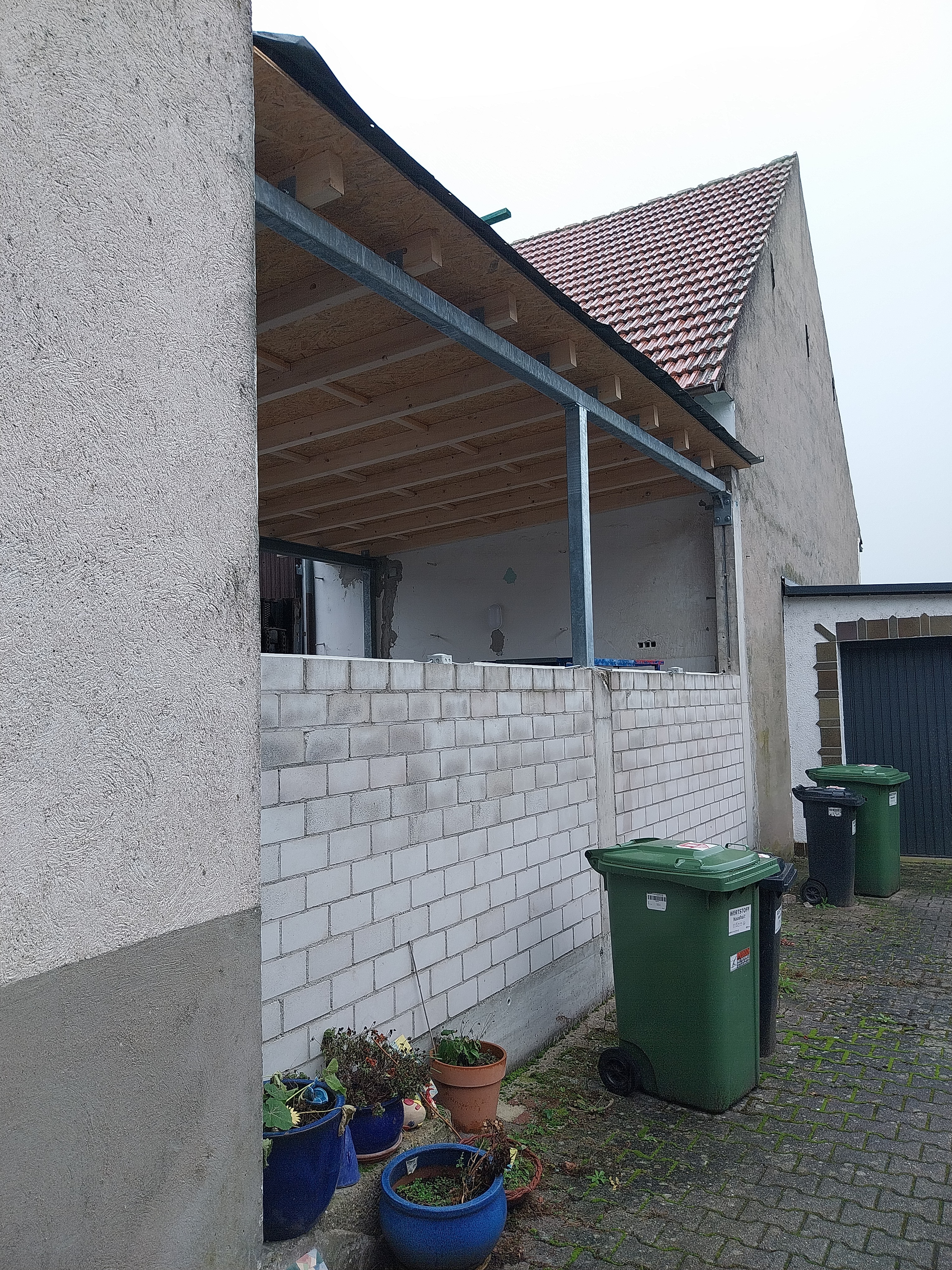 ein Nachbar hat eine Überdachung zwischen seiner Scheune und seinem Seitengebäude entlang der gemeinsamen Grundstücksgrenze errichtet. Ob das eine Überdachung oder ein Carport sein soll ist unklar. Das ganze ist auch noch nicht fertig. Laut Aussage des örtlichen Bauordnungsamtes handelt es sich wohl um ein privilegiertes verfahrensfreies Vorhaben gemäß Anhang zu § 50 LBO BW ohne Abstandsflächen innerörtlich nach § 34 BauGB. Wir gehen jetzt mal von der baurechtlichen Zulässigkeit der Überdachung aus. Über die Höhe (über 3 m) kann man sich streiten oder auch nicht.