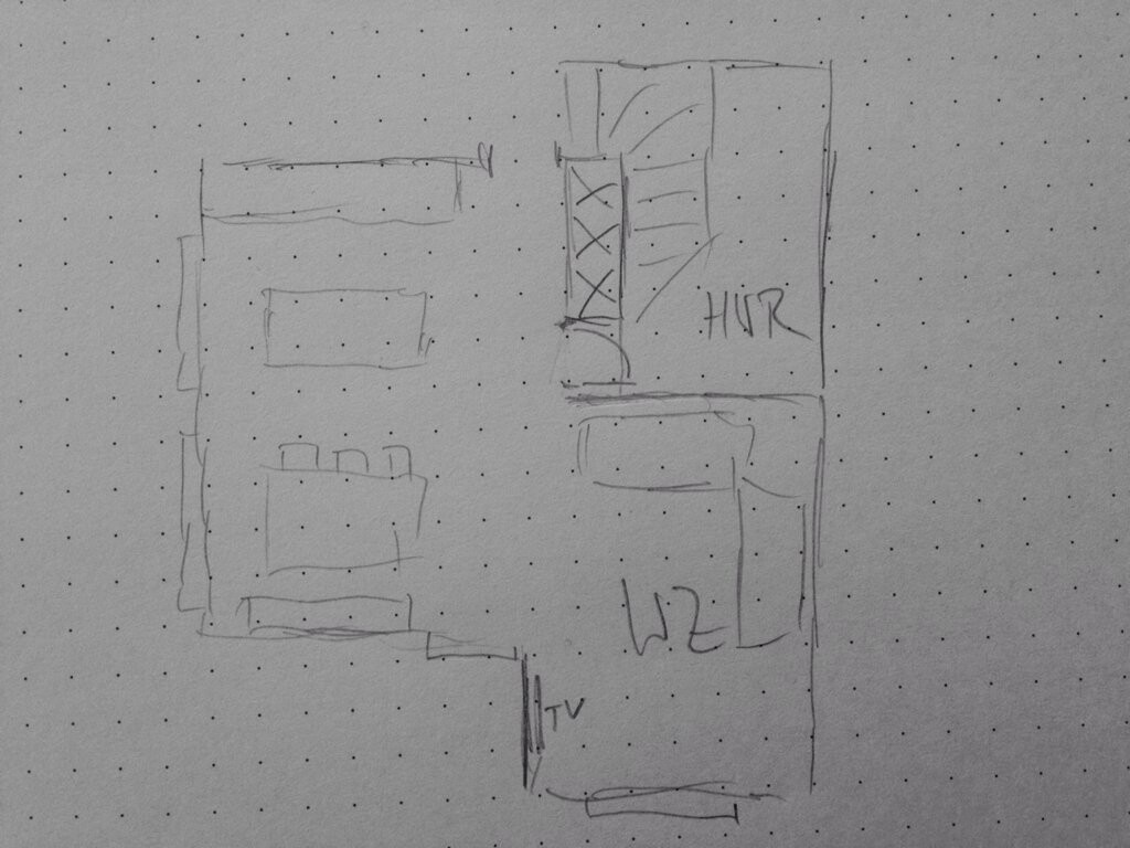 Skizzenhafter Grundrissplan eines Hauses mit Wohnzimmer, TV-Bereich und Aufteilung.